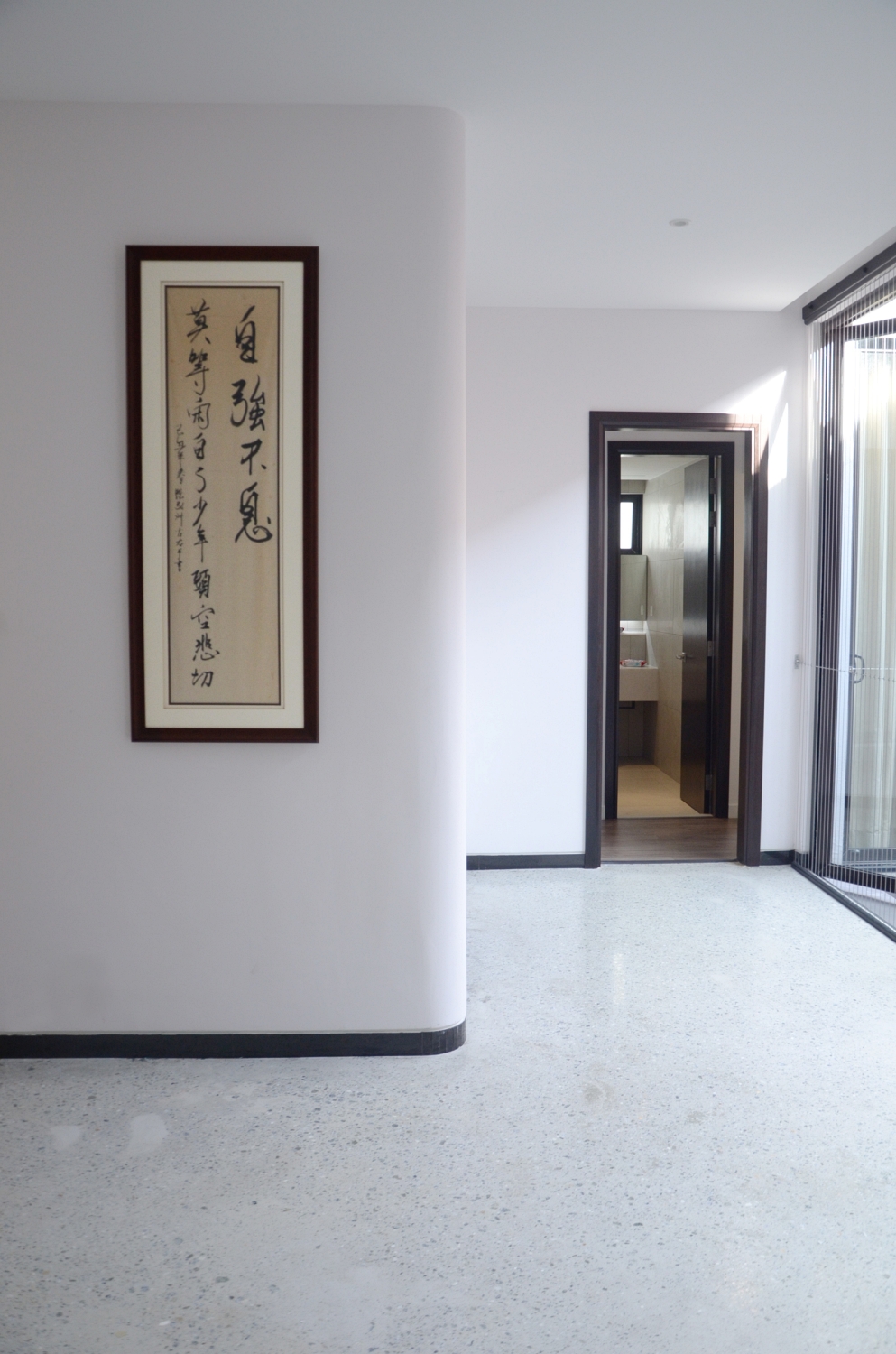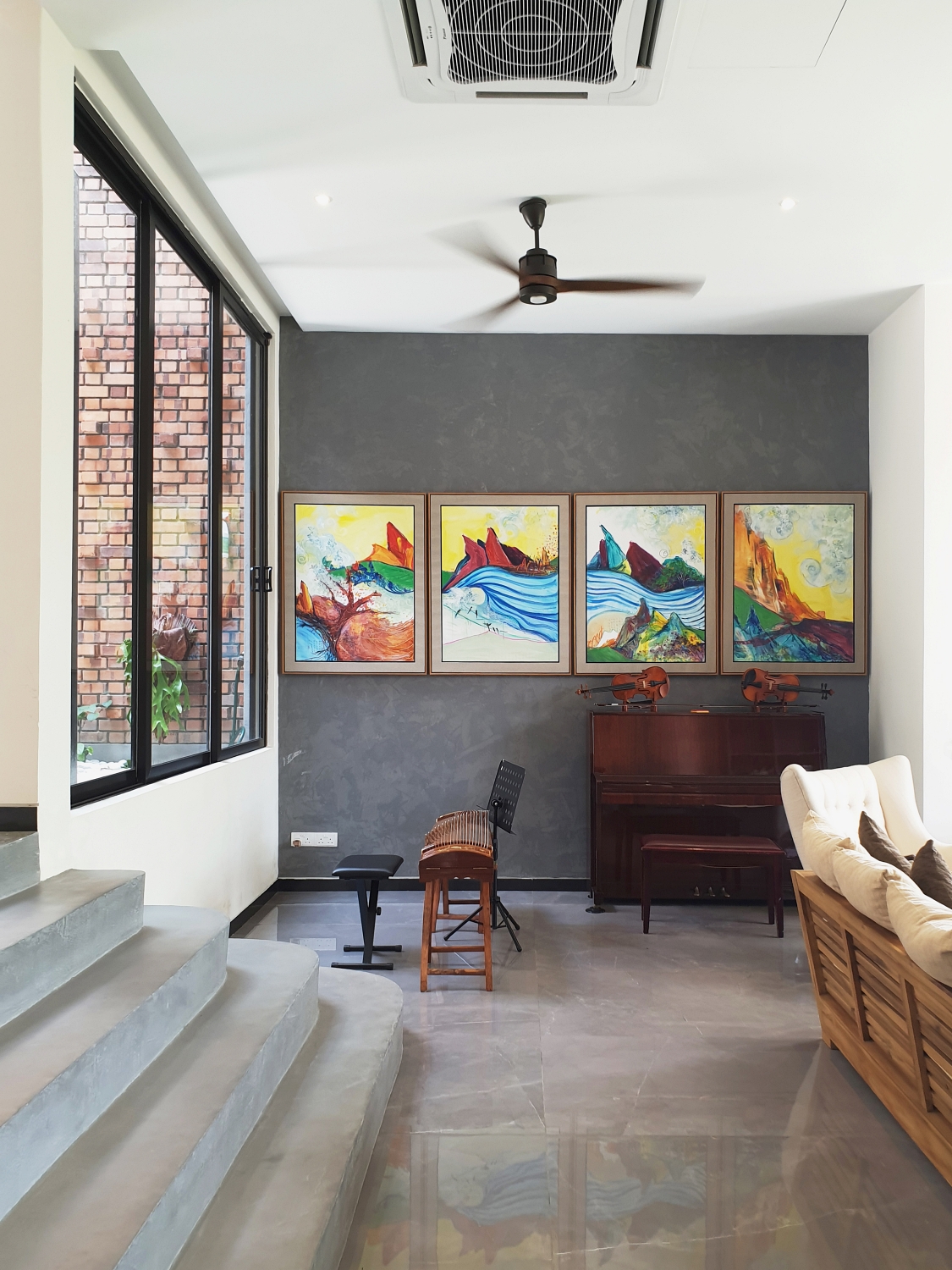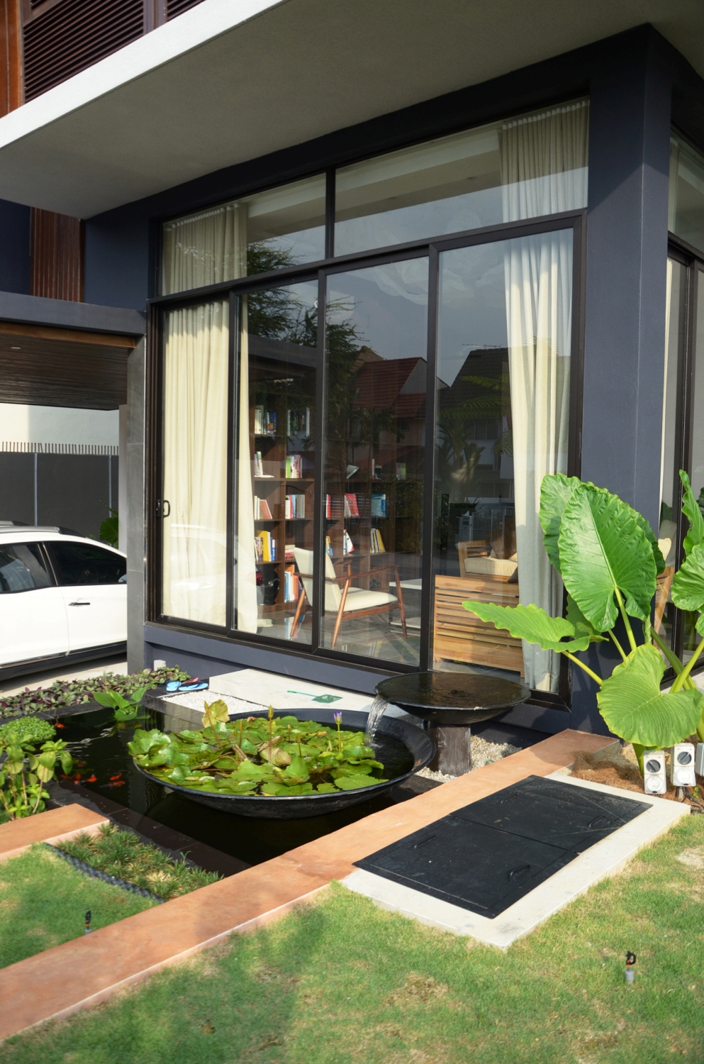 Construction materials were mostly sought from local sources.To create a homey yet timeless effect, the selection of materials was via a natural approach.Building materials were made to appear in their most natural state for instance, railway sleepers, teak wood flooring, fair-faced bricks, Balau timber strips, Nyatoh tabletop, concrete vent blocks, up-cycled and polished concrete floor.Materials like autoclaved cellulose fibre reinforced cement board, timber grain louvers, polished concrete and textured spray tile paint were used to keep the building low in maintenance and for it to glow and look good effortlessly in a Zen way.
