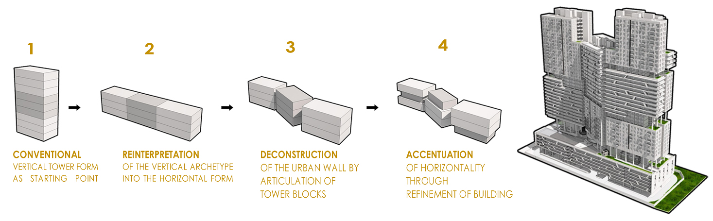 To avoid uniformity and repetitiveness of the urban wall usually synonymous with high density living, the building form is articulately fragmented to create a bespoke architecture.