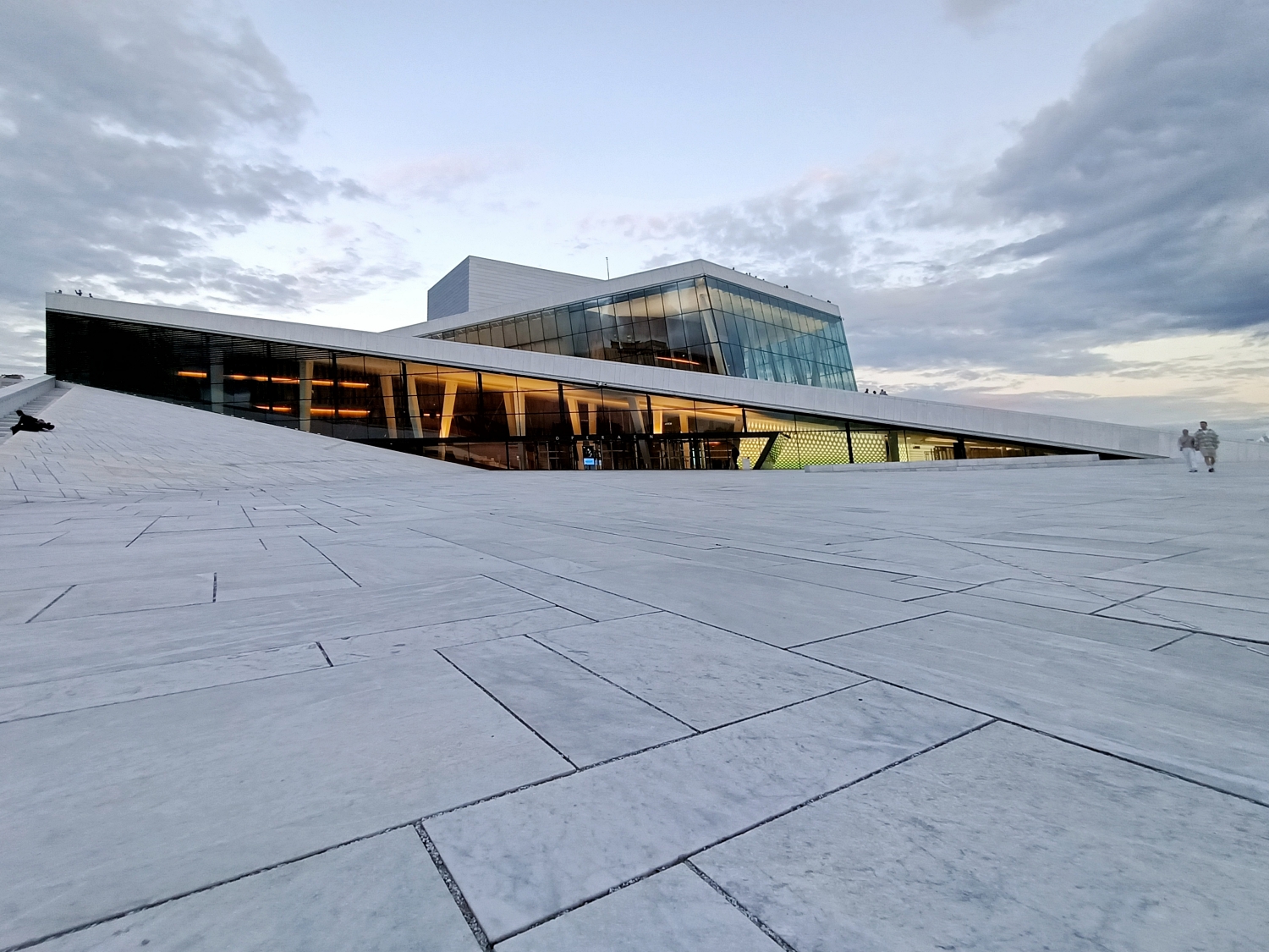The sloping roof invites visitors to walk up and enjoy the view of the city.But not only that: as it is now summer, we see people sitting down, having picnics and sunbathing on that slope.Come to think of it, I don’t think we can see that in other opera houses in the world.A truly original piece.