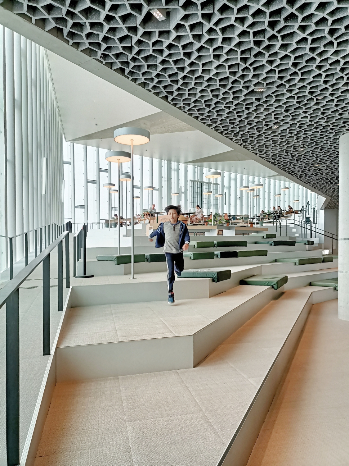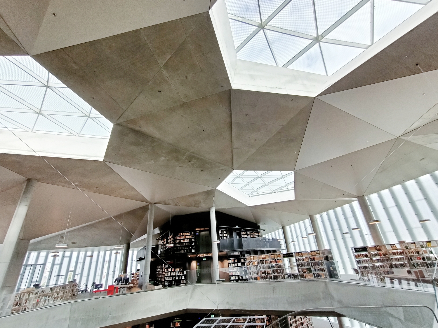 Recently opened in 2020 is the Deichman Bjorvika, Oslo’s new main library.The exterior form is skewed and dynamic but could be easily misunderstood at first glance.It is hard to make up what it tries to achieve, or if there is any message behind it.But after some time of observing, one would start to see the cantilevered floor that hovers over the entrance and a public plaza that also acts as an entrance statement from the piers, the Fjord to the city.