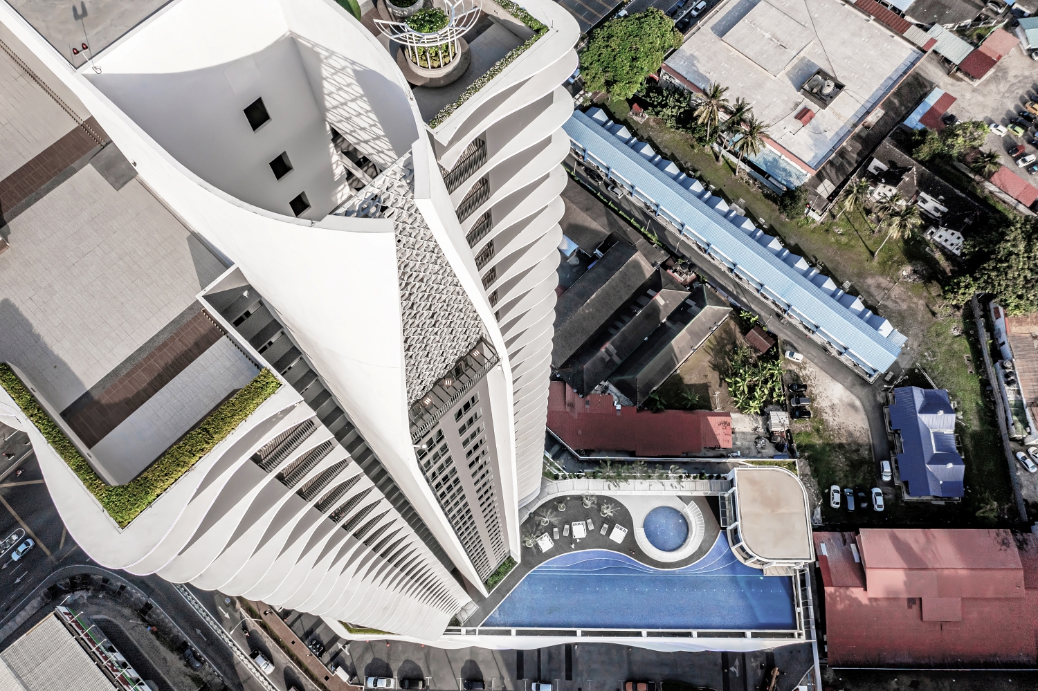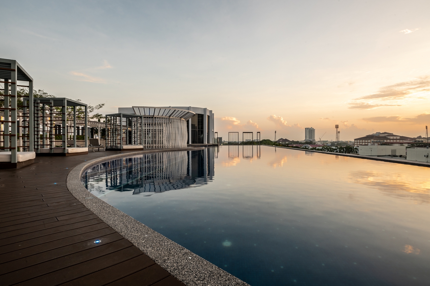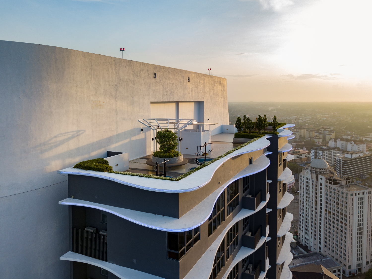 The beauty of Islamic arches and sensual curves are further expressed in the landscape and interior design of the facility floor at Level 6.The infinity pool also embraces these curves with the planter boxes offering seating spaces at the curved concaves.To match the design language of the building façade, wavy panels are introduced in the design of trellises and the ceiling at the Lounge of Level 6.