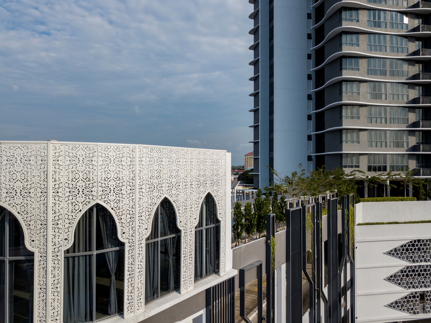 The curvature language of the Islamic arch was also consistently carried through with the curvy copings around the building, resembling the fluidity of the praying robe.Random and repetitive curvy copings which wrap around the entire podium and tower create a smooth transition of the vertical transformation whilst highlighting the sense of horizontal extensions.Apart from portraying this modern outlook of the building, the curvy copings also function as an important shading device against extreme tropical and monsoon weather.