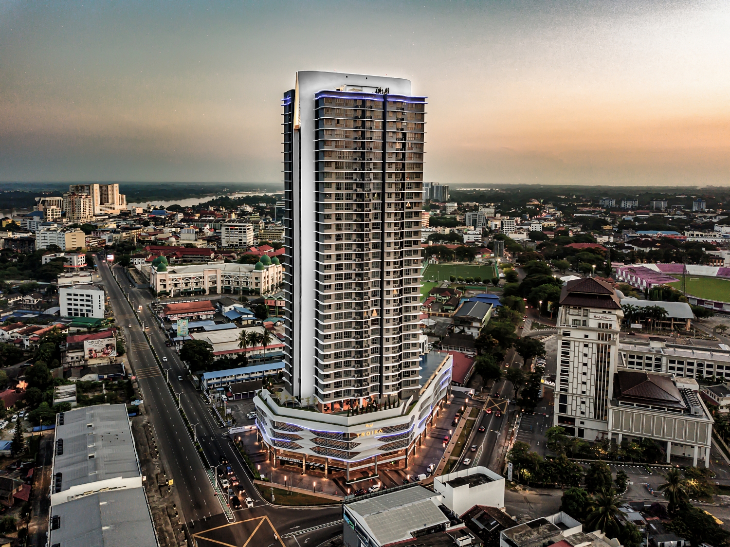 The three-dimensional arch, a contemporary interpretation of an Islamic arch – crowning the north-east and south-western corners of the tower, visible from afar – adds the latest Icon to Kota Bahru.The Islamic arch also inspired the treatment for the openings at the podium façade.Rotated arches are arranged to form opening patterns around the podium.To act as a screen, repetitions of the hexagon, a commonly used geometry in Islamic architecture were utilised to create tessellated six-pointed stars to infill these rotated arches; these patterns are also repeated at the three-dimensional crown arches.