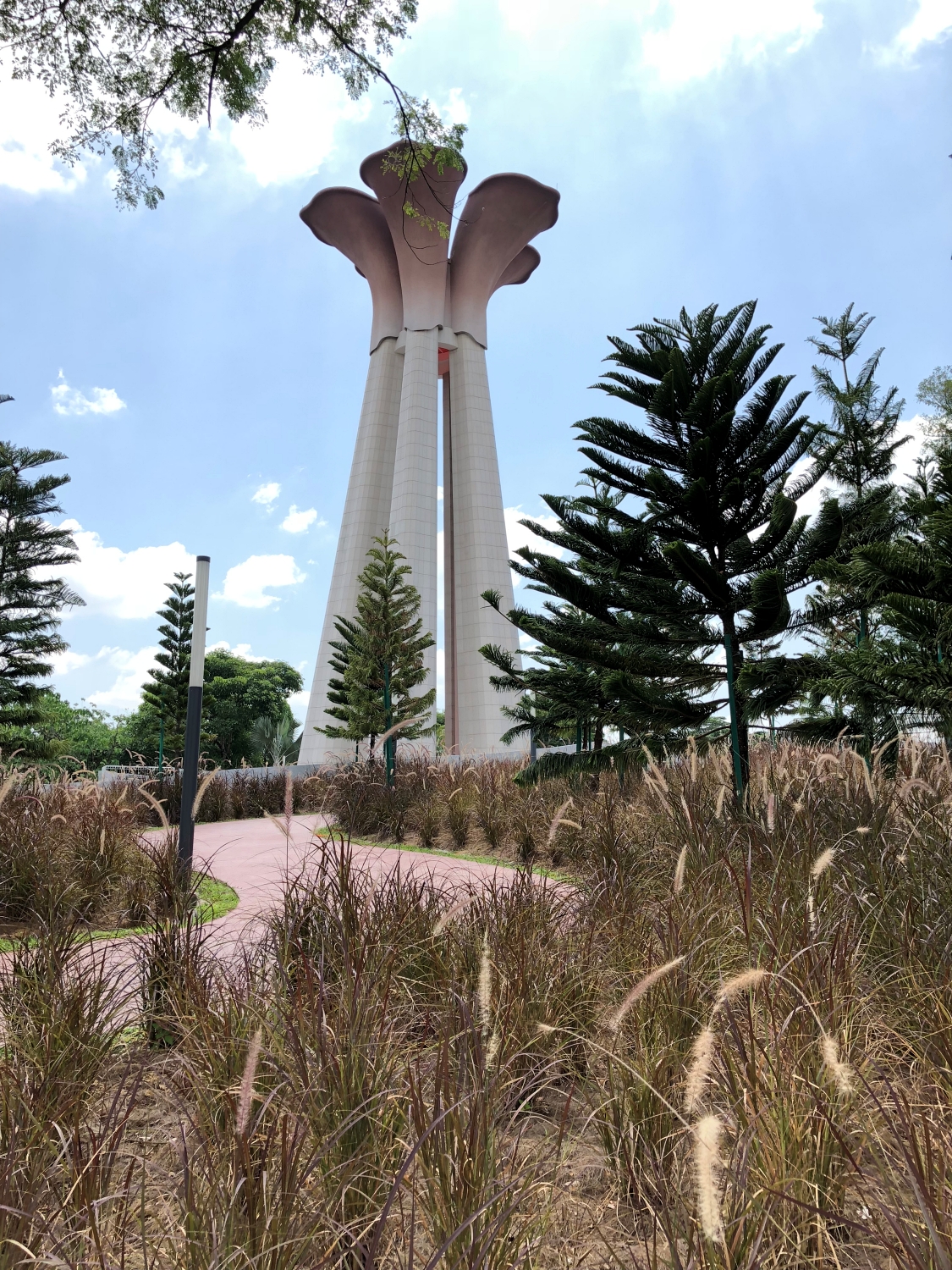The flowering Hibiscus at the top of the tower highlights the unity of all races and their collective hard work to achieve harmony.At the base of the tower, the flower pistil with water feature conveys new energy of life.The centralized location of the Tower in the park is an analogy of the impact of a bomb, whose energy radiates outward giving rise to the Hibiscus Memorial Peace Tower.