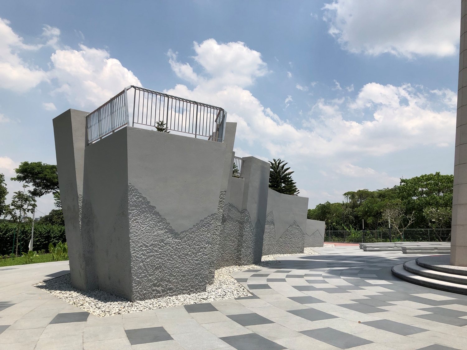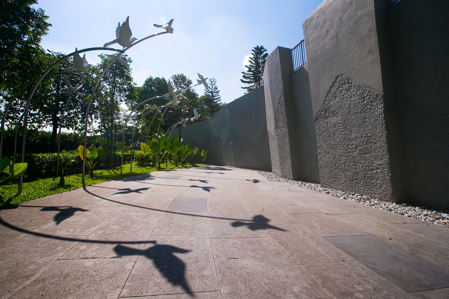 The Park. The conflict and collision of The Japanese and Malayan armies are represented by the two ascending raised gardens.Specially selected flora contrasts against a backdrop of bullet fractured walls.Stone aggregate coloured concrete walkways meander in the raised gardens of the park.The fragmented entrance challenges visitors to comprehend the events of 1941.88 pigeon sculptures flying freely throughout the park symbolise Malaysia’s quest for continued peace.