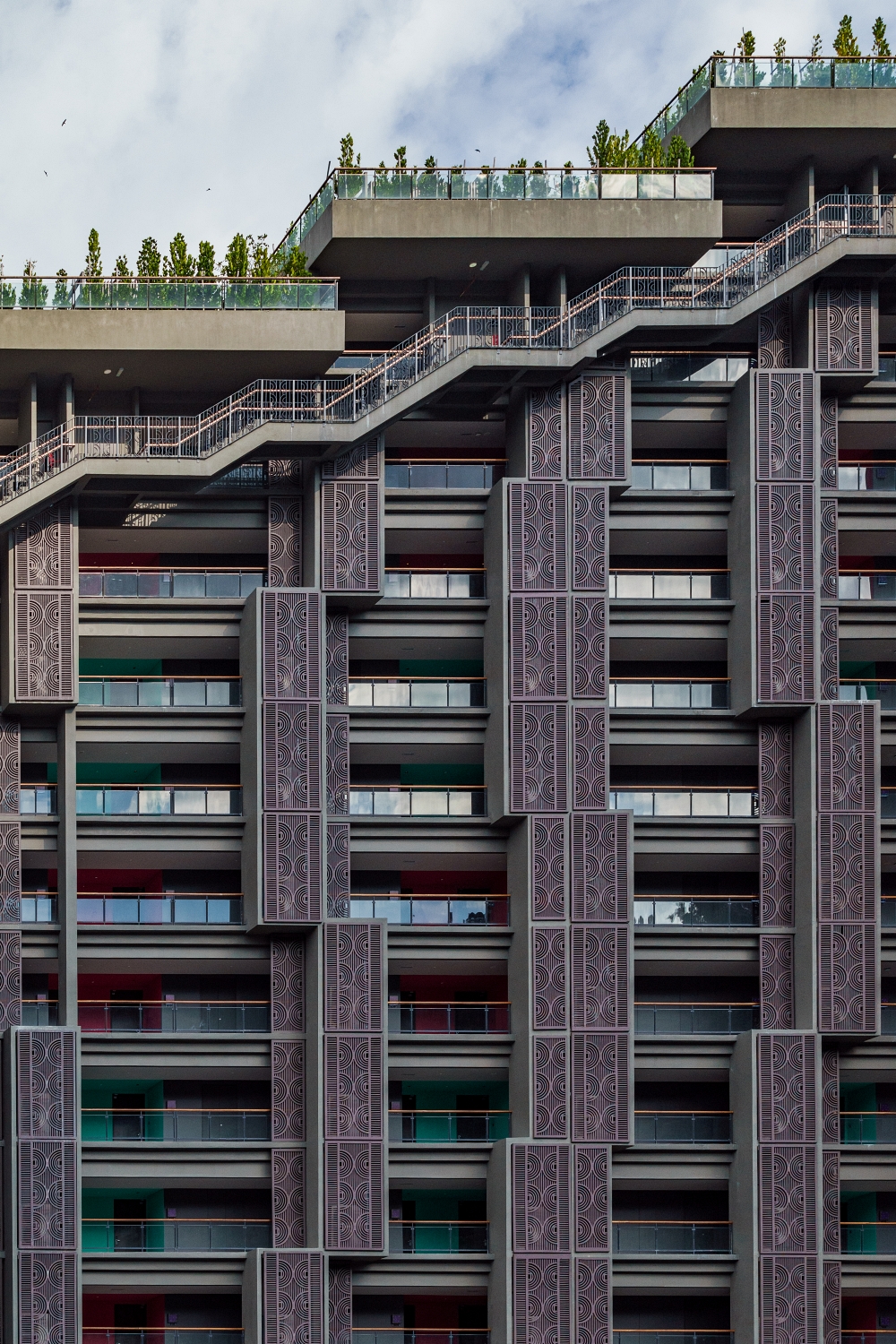 Peranakan-inspired screens over the AC compressors on the serviced apartments façade.