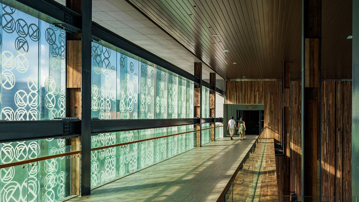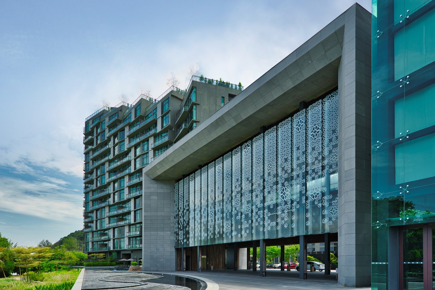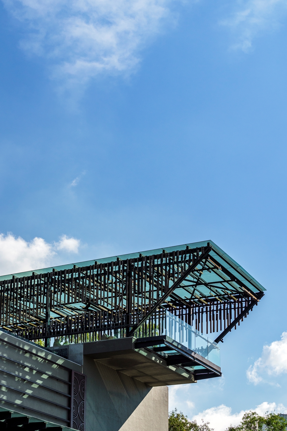 The long, folded block breaks down the length of the building on a narrow, elongated site, allowing the guest rooms to have varying views of the sea and forested cape.The angled block also relieves the sense of the long corridors in the single-loaded plan.The corridors are kept open for guests to enjoy the forest views of Penang Hill, punctuated with screens of the metal grill and custom-cast GFRC screens with a geometric Peranakan-inspired motif that creates a rich play of light and shadow to mitigate the typical relentless wall-of-corridors façade that plague many seafront hotels and apartment blocks.