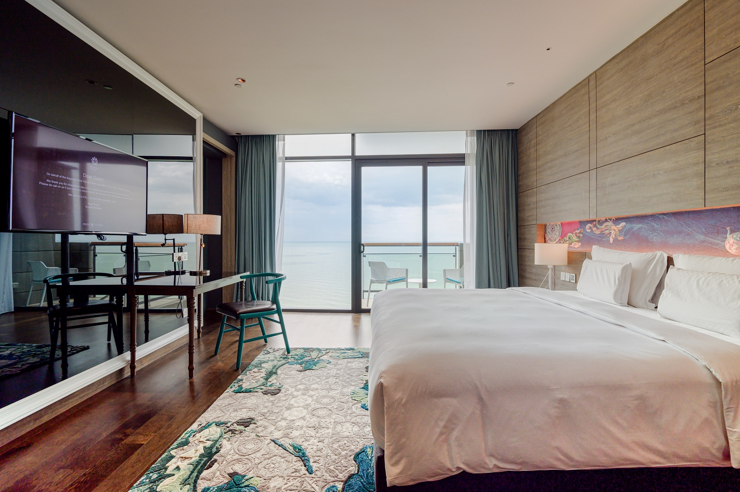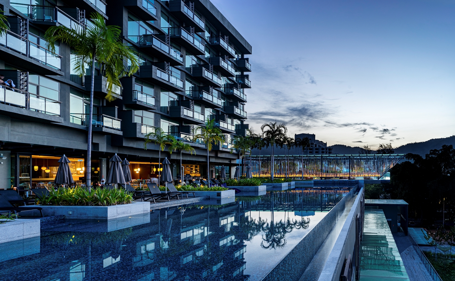 At the seafront façade, the long building block is punctuated with several multi-storey sky terraces which aspire to extend the greenery of the majestic backdrop of Penang Hill, through the building and out to the seafront – reinforcing the theme of the meeting of Forest and Sea.The seafront façade of the 9-storey hotel block is punctuated by alternating pairs of verandahs to create a modulated façade and greater privacy for guests.The Service Apartment block has a terraced roofline with cascading roof gardens to soften the building profile against the mountain backdrop.