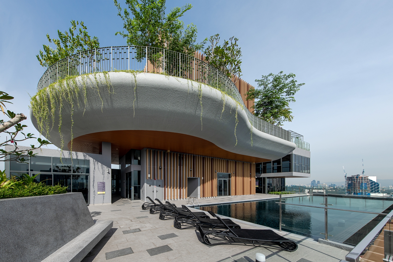Its concrete façade is softened by the saucer-shaped ‘crown’ which holds an elevated landscape deck, offering a magnificent view of the cityscape while providing a ‘Zen’ space for a peaceful respite.