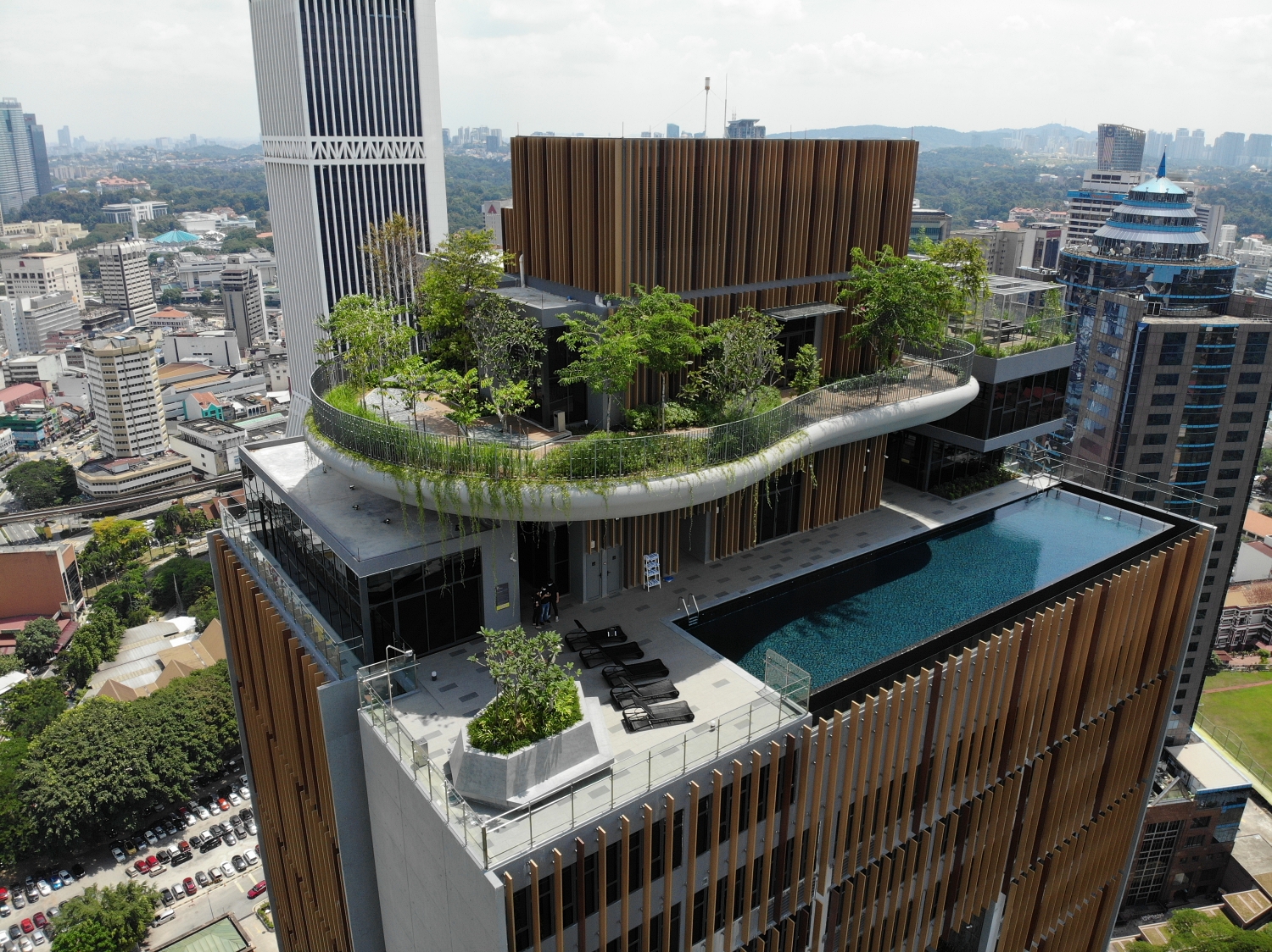 Ceylonz Suites is a 39-storey office tower in the heart of Kuala Lumpur, Malaysia presenting a refreshing take on work, life and play.It offers 442 studio-sized office units (384 – 578 sqft) which can be modelled into micro-apartments or co-working spaces as required.Despite the limited 0.23-hectare land, the compact design packs ample amenities like the Sky Gym, Rooftop Infinity Pool, Sports Lounge, cafeteria, mini-mart and work-centric facilities like conference and meeting rooms, Business Lounge, etc.What also sets the building apart is its unique timber toned façade screen that doubles as a shading device against the harsh tropical climate.