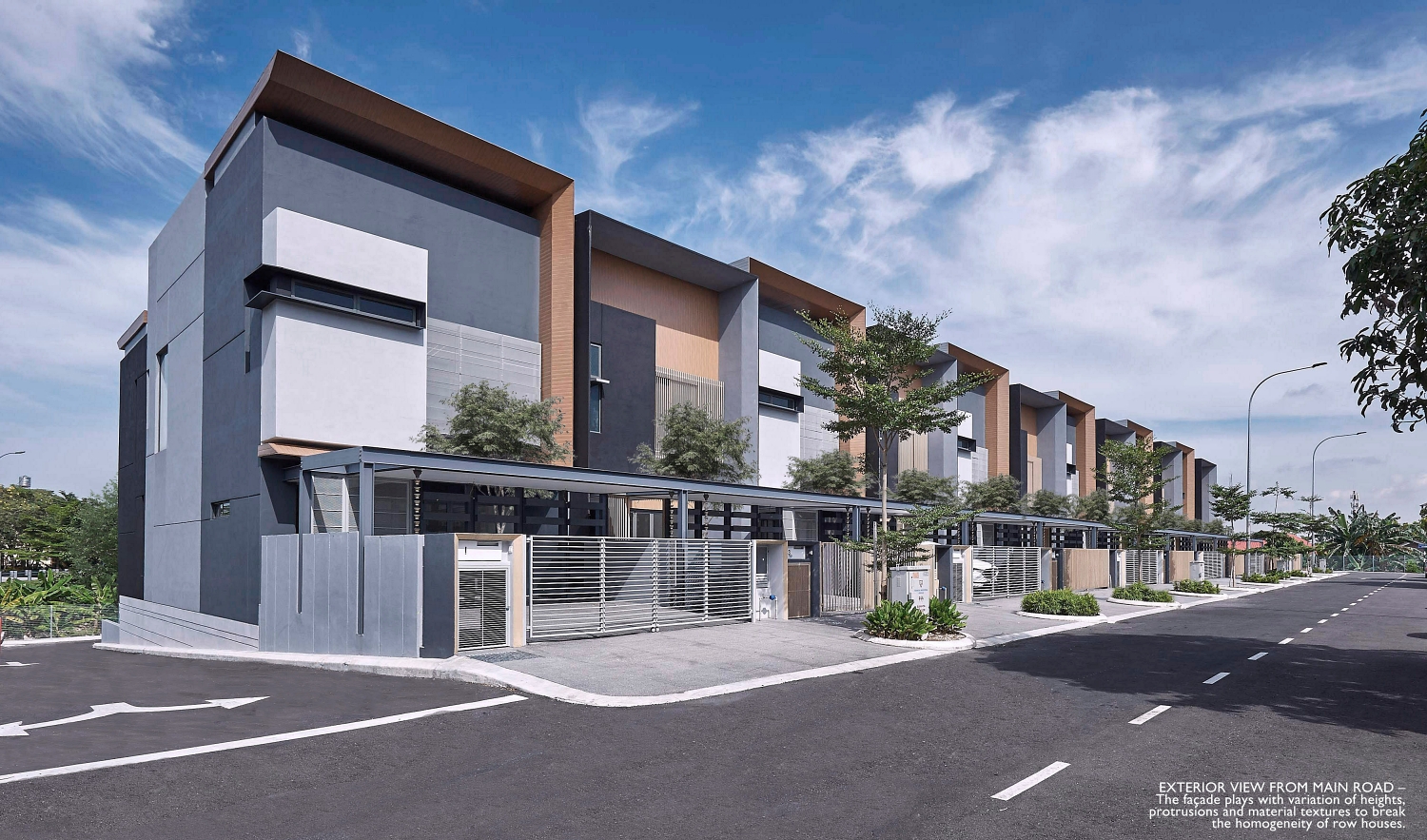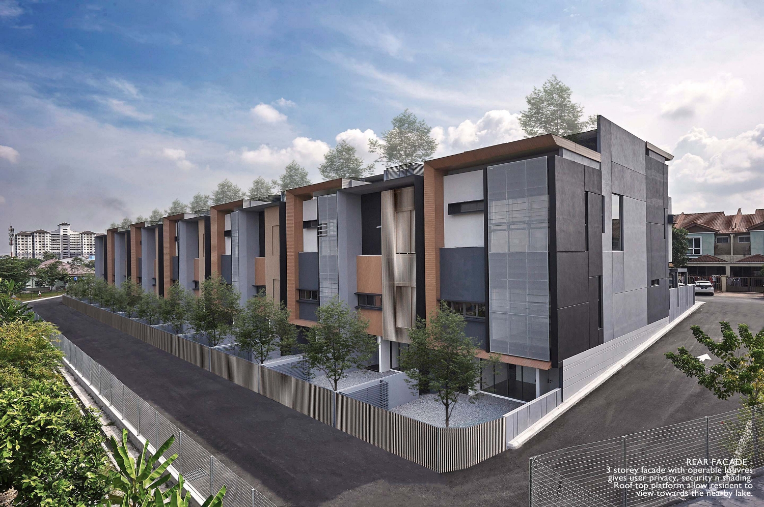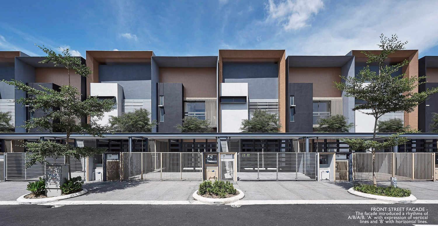 Twelve units of two-and-a-half-storey linked terrace houses sit within an elongated-shaped 1-acre land in Puchong, a sub-urban area of Selangor.To the north and west of the site is the fringe of the metropolitan area with small villages, vast landscapes and lakes.The external design of the houses is articulated in two variations, expressing different built heights, colours, and finished textures to break away from the norm of extreme linearity in Malaysian terrace housing design.Each unit is built on a 6.4m x 33m plot size with 264 sqm of floor area for family living.