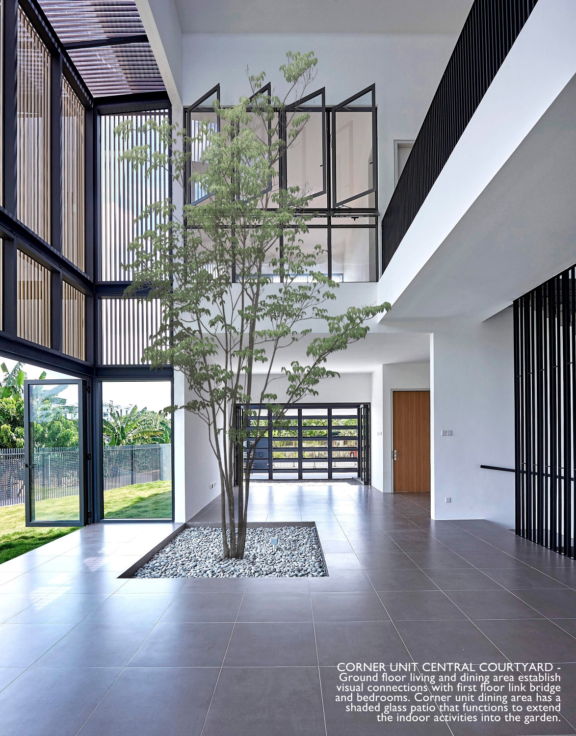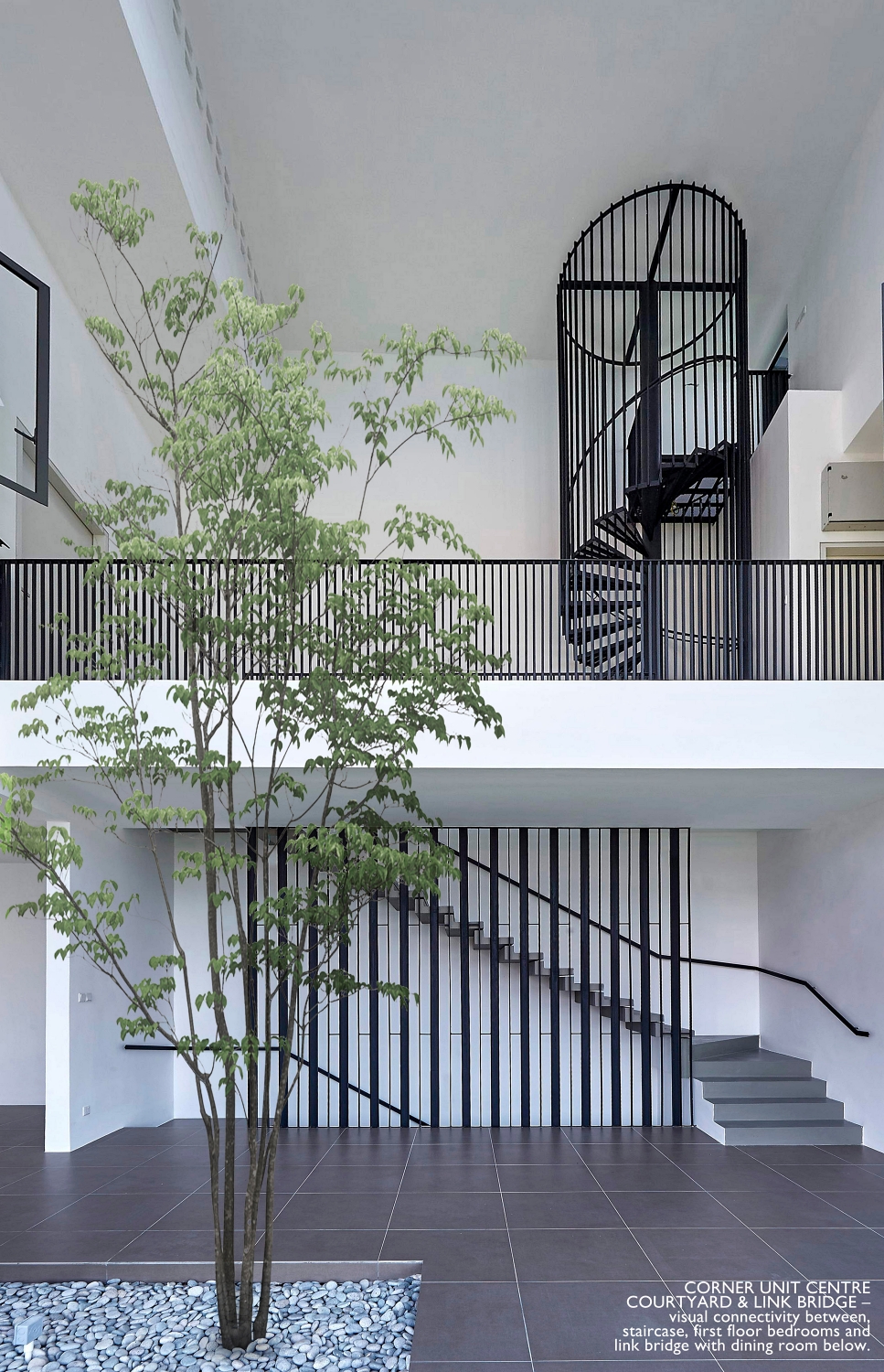 Passing the main door, internal spaces are planned around a central triple-volumed courtyard void space naturally lit with landscaping.Sunlight filtering through the rooftop skylight penetrating 3 storeys deep into the house; the architect took reference from Malaysian heritage shophouse design as inspiration.As a strategy to blend nature into architecture, owners are encouraged to plant trees in the central courtyard.Living hall, dining, and kitchen areas flanking the central courtyard can enjoy the greenery amidst a bright, naturally lit high-volume environment.This is a design response to address the issue of dark interiors in a standard Malaysian terrace house plan.