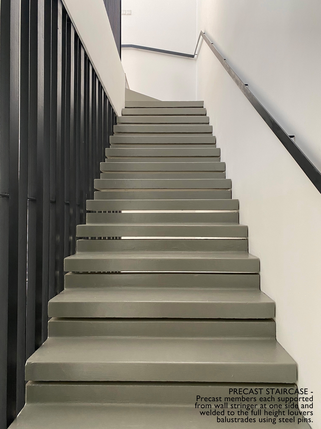 Walking up the precast concrete cantilevered main staircase to the first floor, one can see the big window for the master and common bedroom opening into the central courtyard.The windows encourage visual connection and interaction between different floors’ users.The external façade of the bedroom has a ‘monsoon window’, each with horizontal top-hung panels that allow air exchange while preventing water from getting in during the monsoon rains.