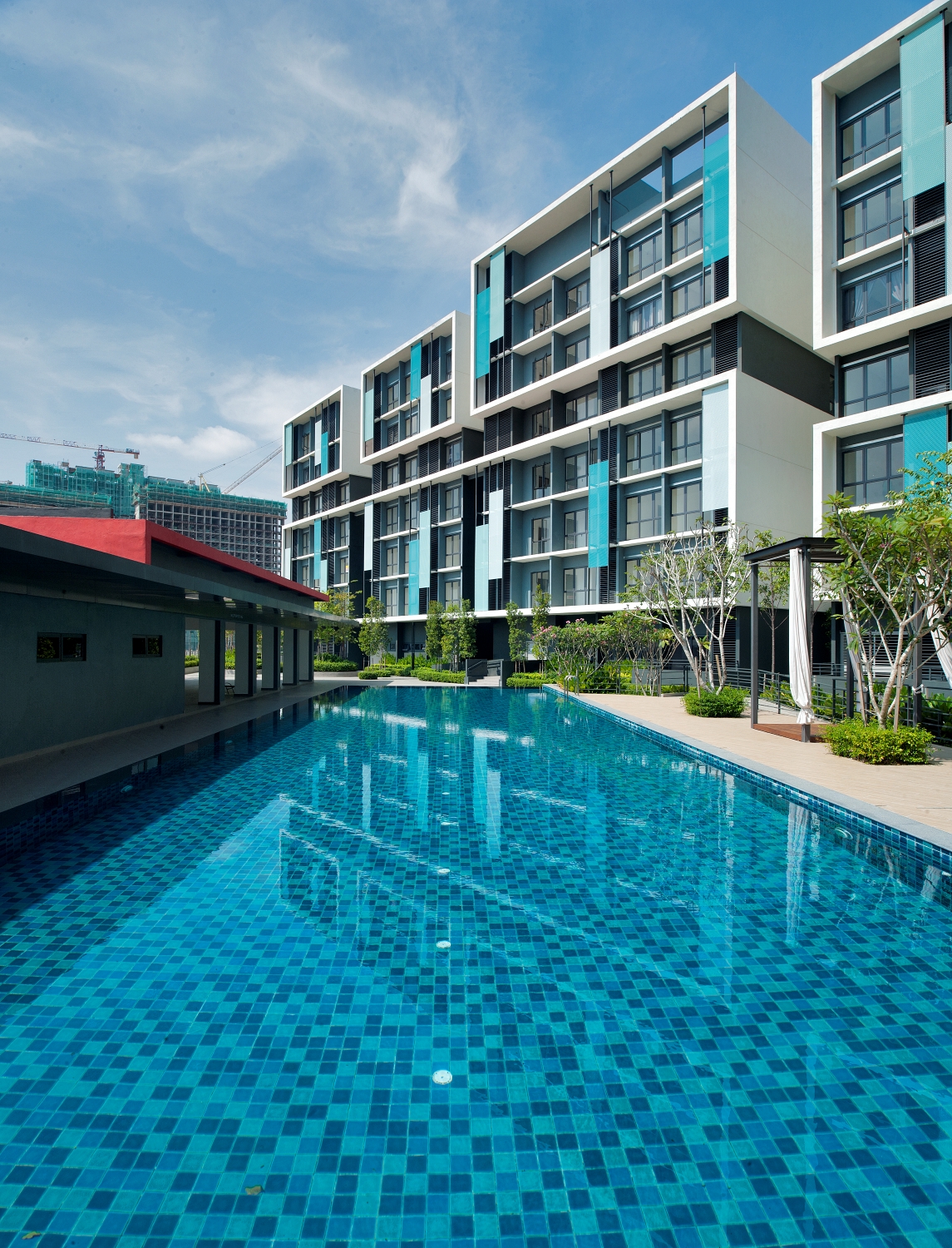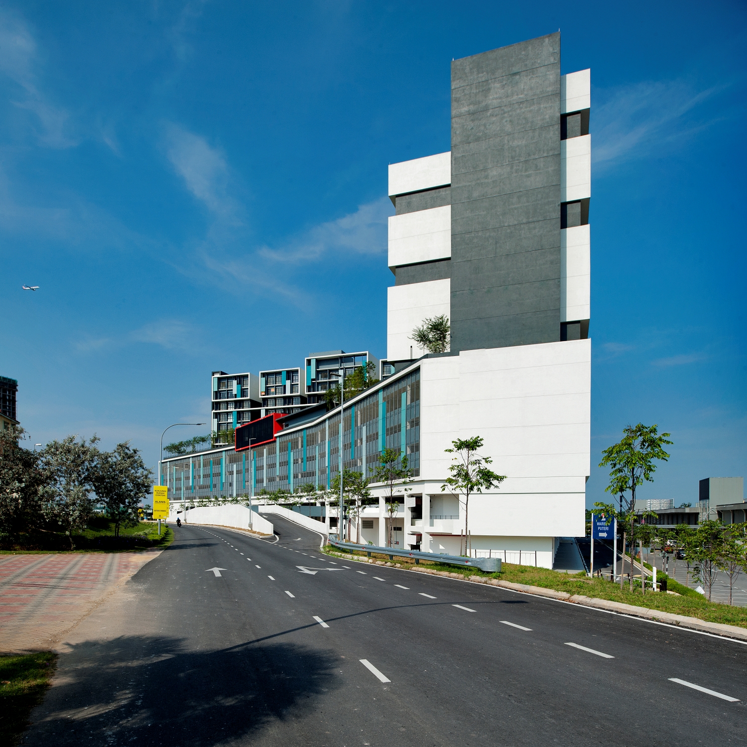 KIP Core Sentral is an embodiment of architectural intentions to challenge the cookie-cutter design and to stand as a representation and inspiration that to be bold and distinctive does not have to be expensive.The modernist cubic design combines the bold use of colours on the façade with a strong expression of solids and voids.The feature of perforated coloured screens extends down from the SoHo units to the podium car parking and is interlaced with meshed screens, allowing for future advertising by retail shop owners.