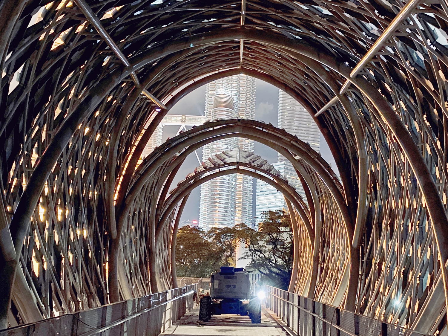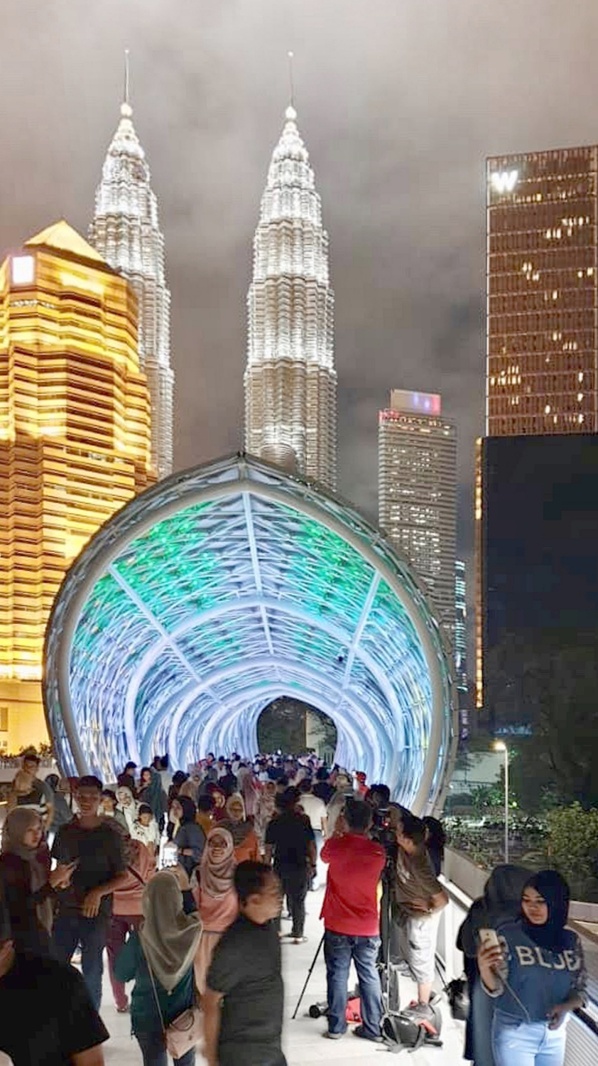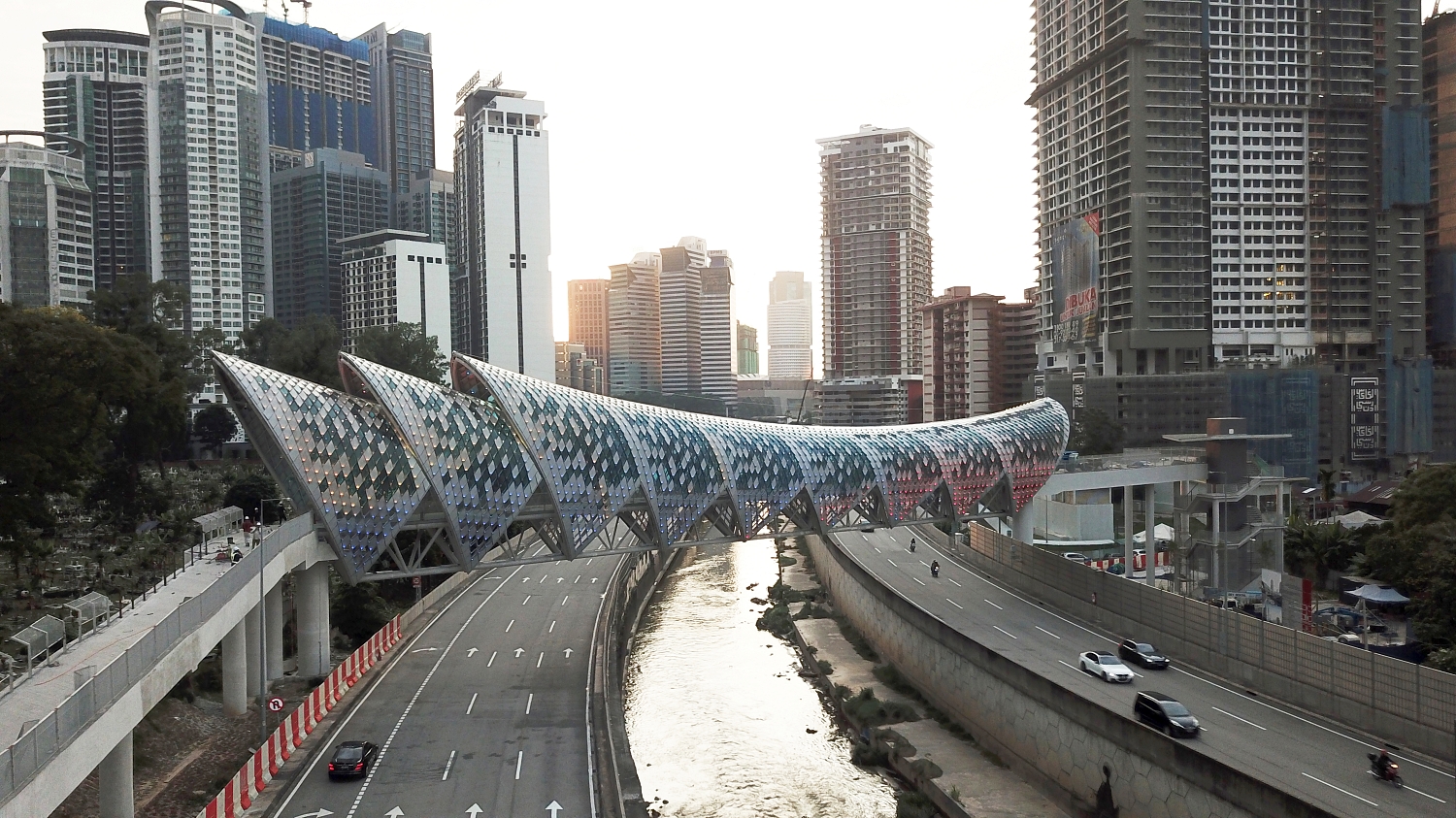 Inspired by the Sirih Junjung, a matrimonial gift hand-crafted from sireh leaves traditionally offered in Malay weddings as a symbol of unity, the Saloma Link represents a ceremonial gesture that embodies the bond between two important enclaves in the city: the affluent Kuala Lumpur City Centre and the traditional village of Kampong Bharu.