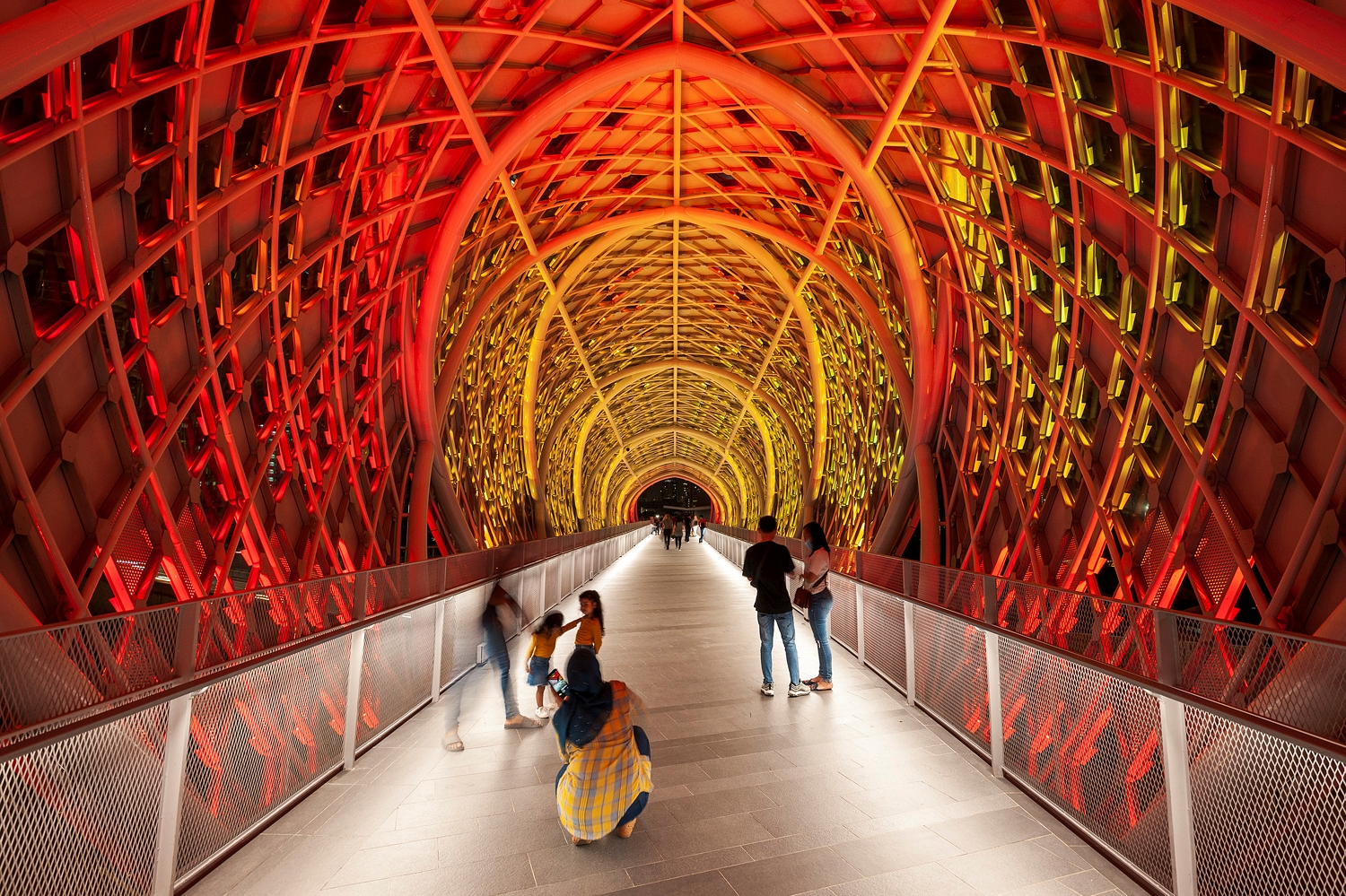 At night, the glimmering studs emit colourful lights making the façade a medium for a variety of programmable lighting displays – using lights as a form of artistic expression.This contributes to the popularity of the bridge during weekends and festive periods.This feature also makes Saloma Link a unique public realm complementing other city attractions.The attraction also creates economic activities in the surroundings.