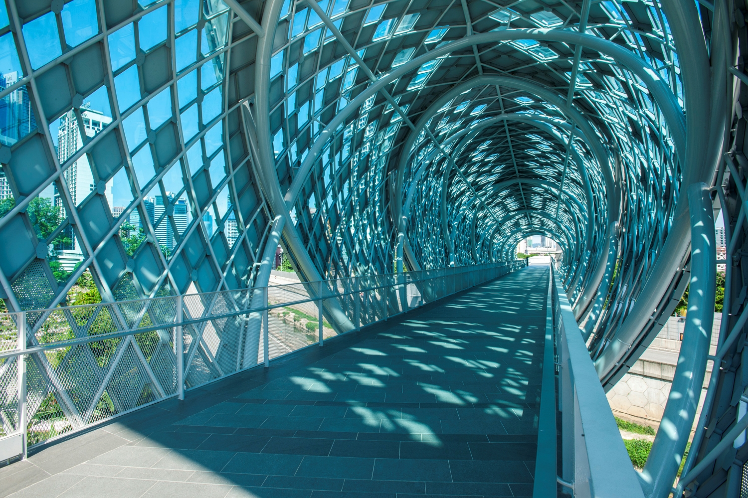 The prominent feature of the bridge is the curved steel roof canopy consisting 4,100 diamond façade modules made of solid, perforated aluminum and glass panels.Each façade panel is discreetly integrated with the structure and equipped with state-of-the-art lighting modules to illuminate the bridge during the night.During the day, the panel’s unique shapes reflect the sunlight giving the bridge a glimmering and distinctive character.