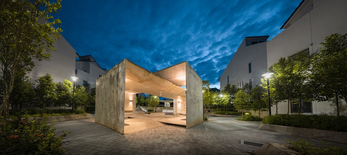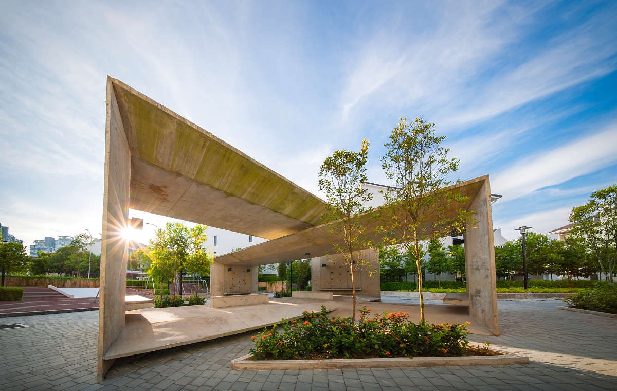 Instead of having luxurious finishing, we proposed a series of modest features to the common facilities such as the central park, urban community farm, mini clubhouse, and linear parks.The central park with its sculptural pavilion takes the centre stage in the whole development.Sheltering the sun and rain, it serves as a gathering point for all residents entering from all sides.The tilted angle of the pavilion was meant to catch people’s attention as they approach the central park area from afar.