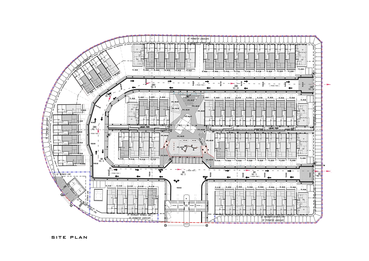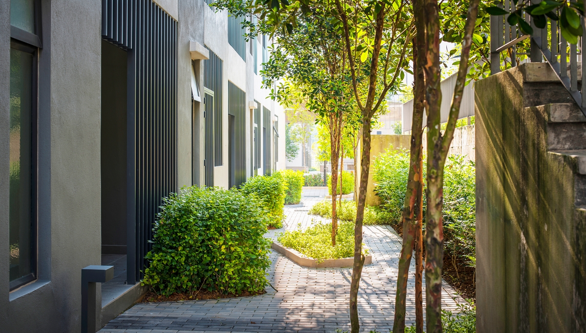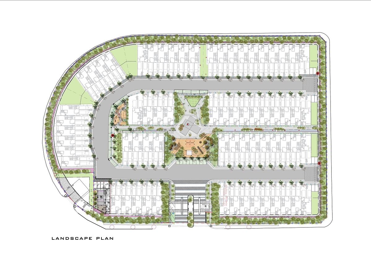 Apart from the main central park, the town villas’ back lanes were converted into linear parks that increase the green ratio of the project tremendously.