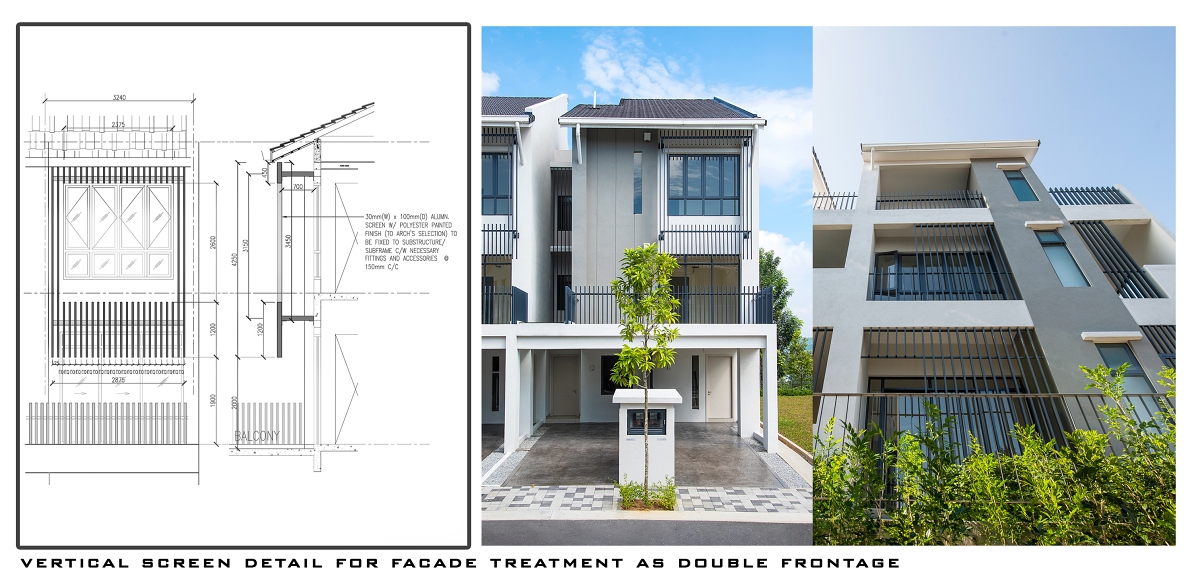 The simple-looking 3-storey townhouses were made interesting with a set-in alcove and non-mirror-image façade arrangement to bring out the 3-dimensional individualistic features of each unit.Care was given to the detailing of the balcony railing, internal railings, aluminium façade screens and corresponding end gable brick wall detailing of groove lines, colour termination and coping.The interplay between the white masonry wall against the intricate lines of black aluminium screens also presented a well-thought façade treatment for the residential units.