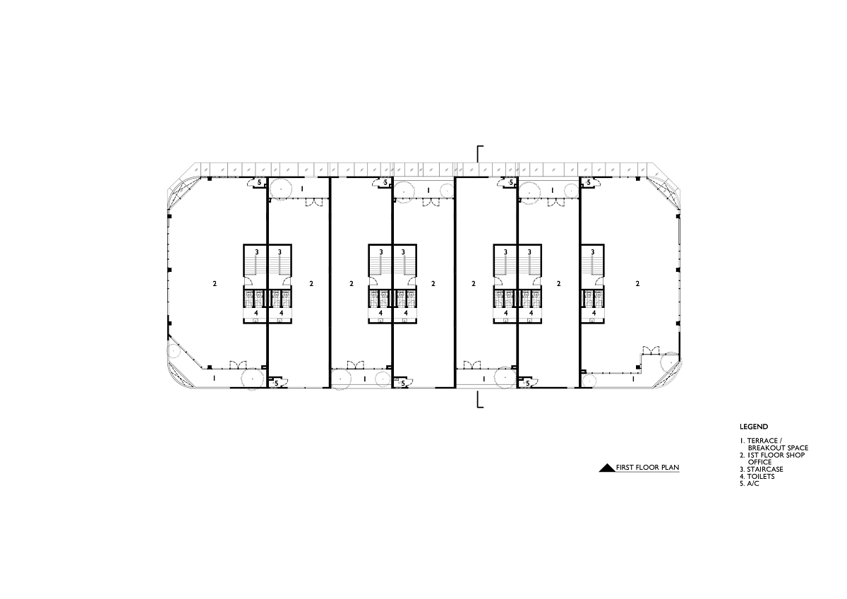 One of the most important features of the two-storey shop is the creation of an outdoor terrace on the first floor.They appear at the front and rear façade alternately between adjacent units.The space is a social gathering space for office tenants, a coffee break area with a great view into the centre of the Uno commercial plaza.