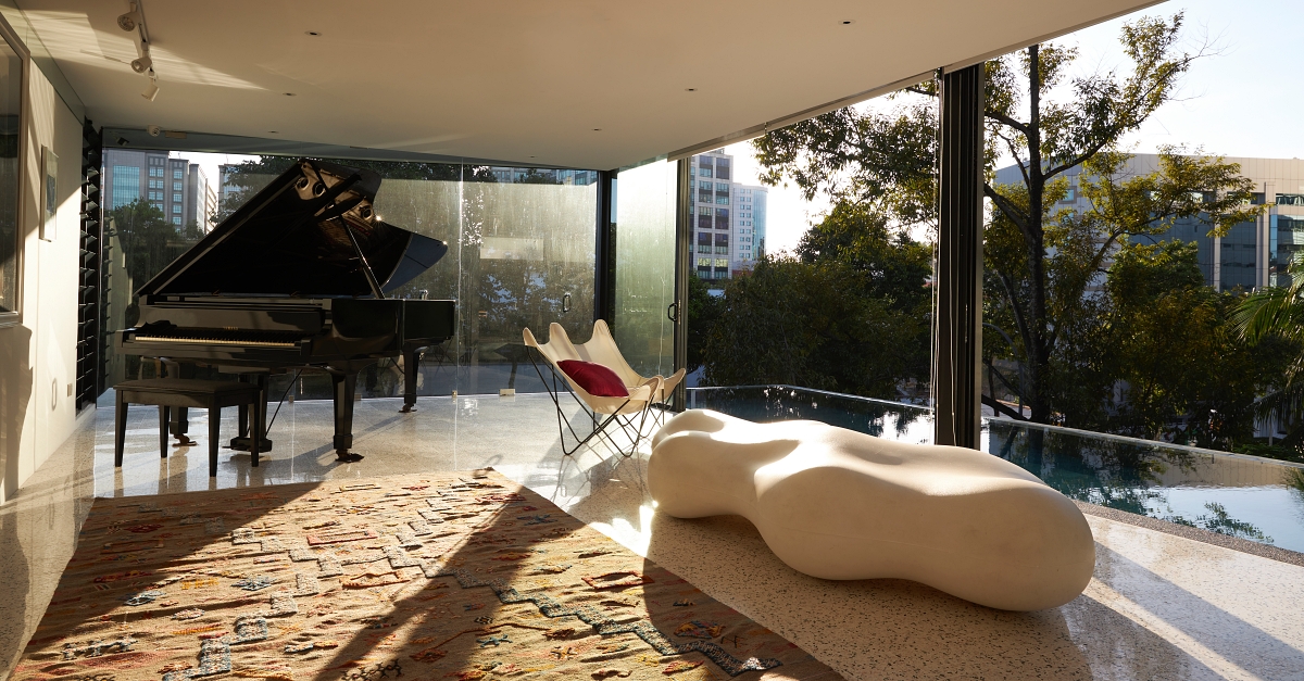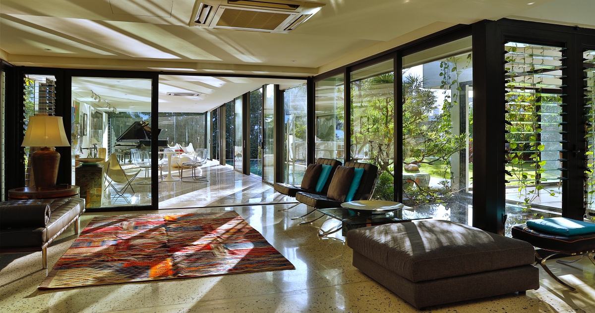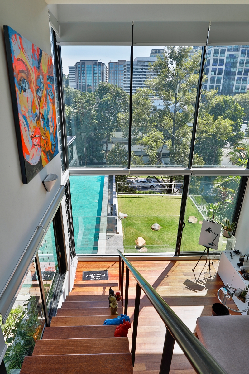 These are in contrast to the black powder-coated aluminum framed fenestrations throughout the house creating a contemporary ambience.The soft palate of wall, floor and ceiling finishes coupled with the collection of modern and antique furnishings create an inviting and homely setting.