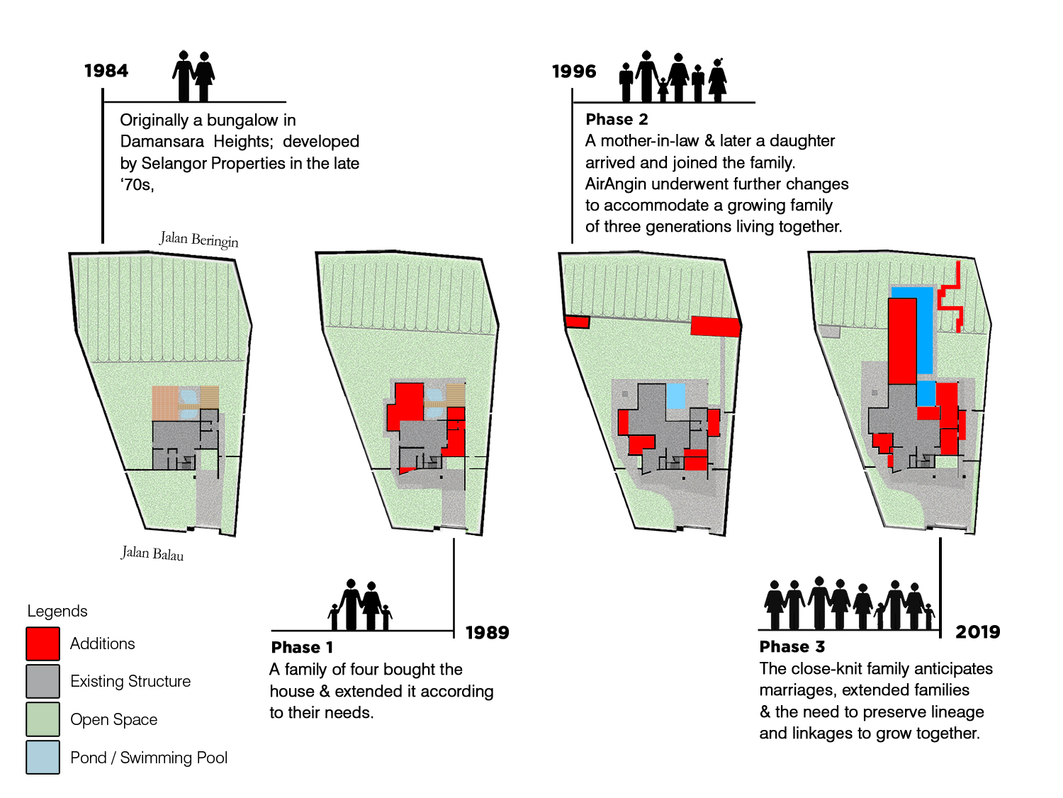 The three phases of growth are driven by the need to accommodate change.Spaces created encourage family-oriented activities, entertainment, gym exercise, yoga and meditation.