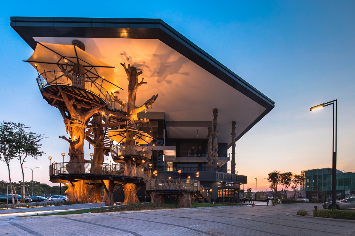The mall’s centrepiece is an extensive angular roof.Supported by high steel columns, its passive design provides shade to the semi-outdoor roof garden, as well as the patio on the northern facade of the mall.In the effort to create community living room spaces while accommodating social distancing, these enlarged outdoor spaces along with a large urban tree house were built to both keep people safe and allow people to meet and socialise.