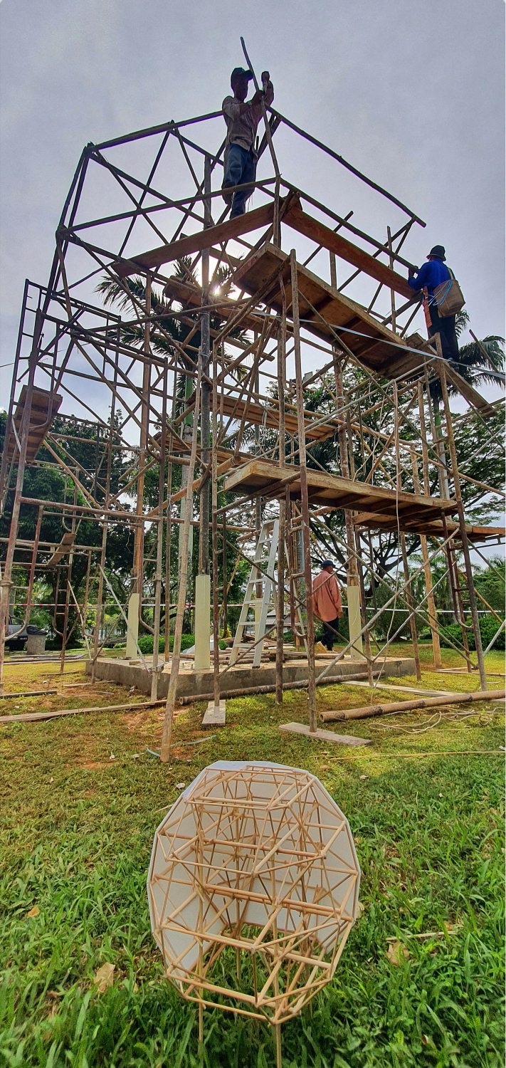 There is a one-day university students event held at MBKS Auditorium and Palmerium Park amid the Moon Pavilion construction – ‘PAM-SC WAD 2022: The Moon Pavilion Installation and Students Workshop’.The event consisted of a bamboo crafing workshop, and bamboo design lectures led by Dr Bambang Karsono and Cr. Wadel Boyod, site visit and installation of the Moon Pavilion. This event was participated by 110 students across five universities in Sarawak (UNIMAS, Swinburne University,UITM from Kuching, Kolej Laila Taib and UTS from Sibu).