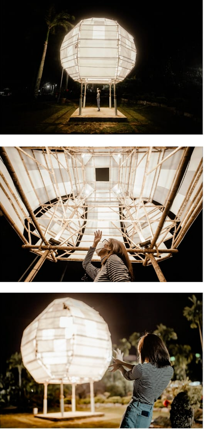 The design process for the Moon Pavilion was also inspired by the Serpentine Gallery by OMA – We envision the Moon Pavilion to be simply a white spherical object floating in the park. It would be translucent in the day with shadows cast from the internal frames and illuminated at night.It can be seen from the main road or within the park, intentionally creating interest for the public. Some children claim it is a Star Wars spaceship ready to take off, a Kongming lantern, big eggs, a lantern that you can hide in, etc. it can be interpreted in any way. Most importantly, to connect architecture, art installations, and creativity to the local community.