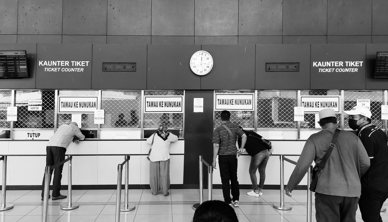 Passengers purchasing tickets to Indonesian island town of Nunukan at the ticketing counter of the Tawau Ferry Terminal. The Ferry Terminal is the gateway to Kalimantan (Borneo) part of Indonesia