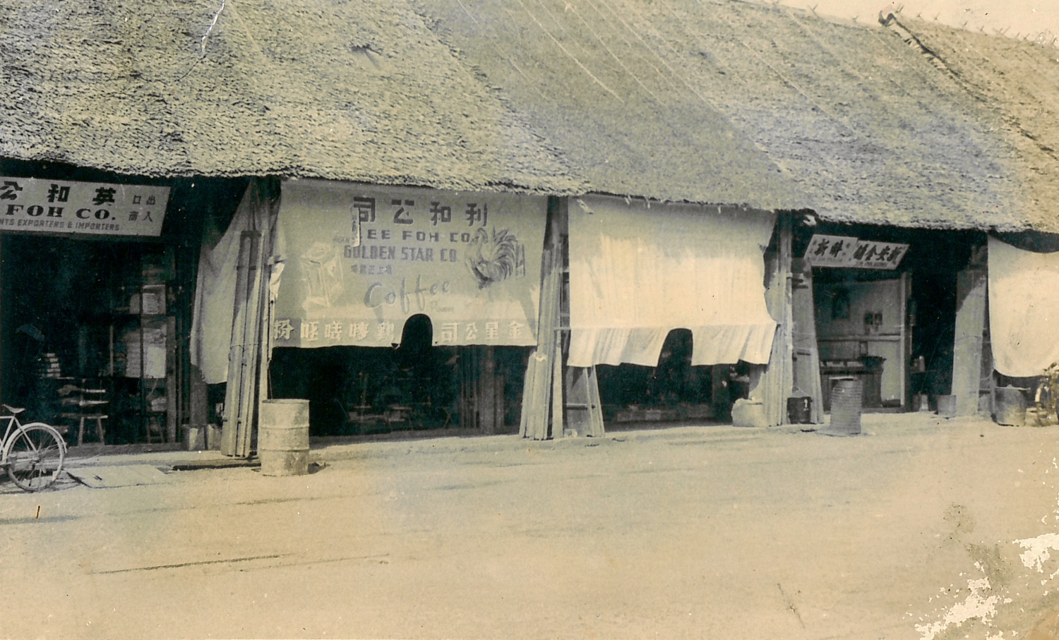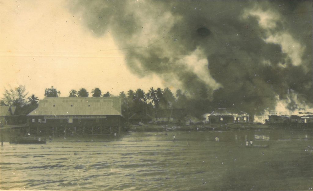 Early wooden shops with thatch roofs of Tawau before the Great Fire of 1953