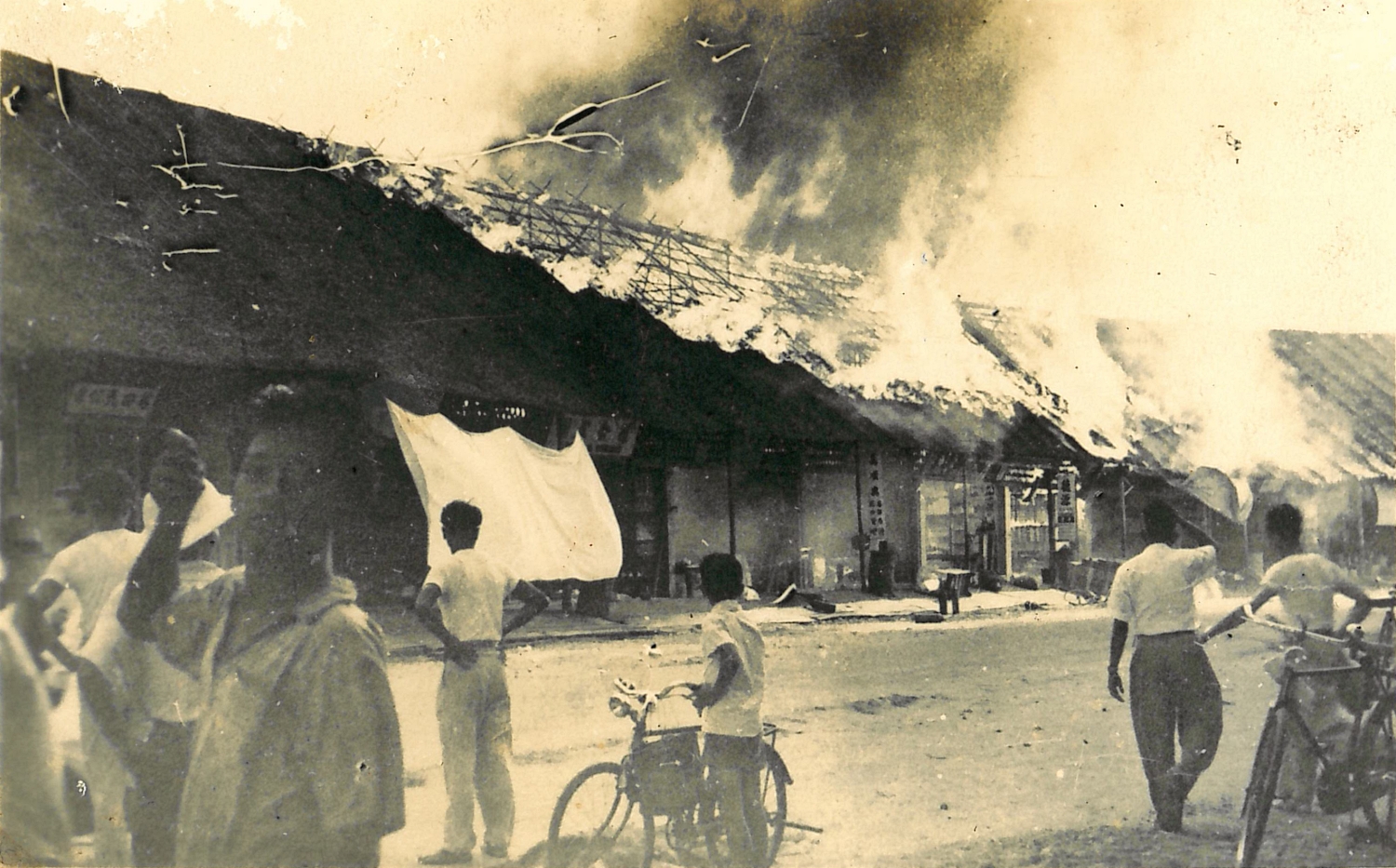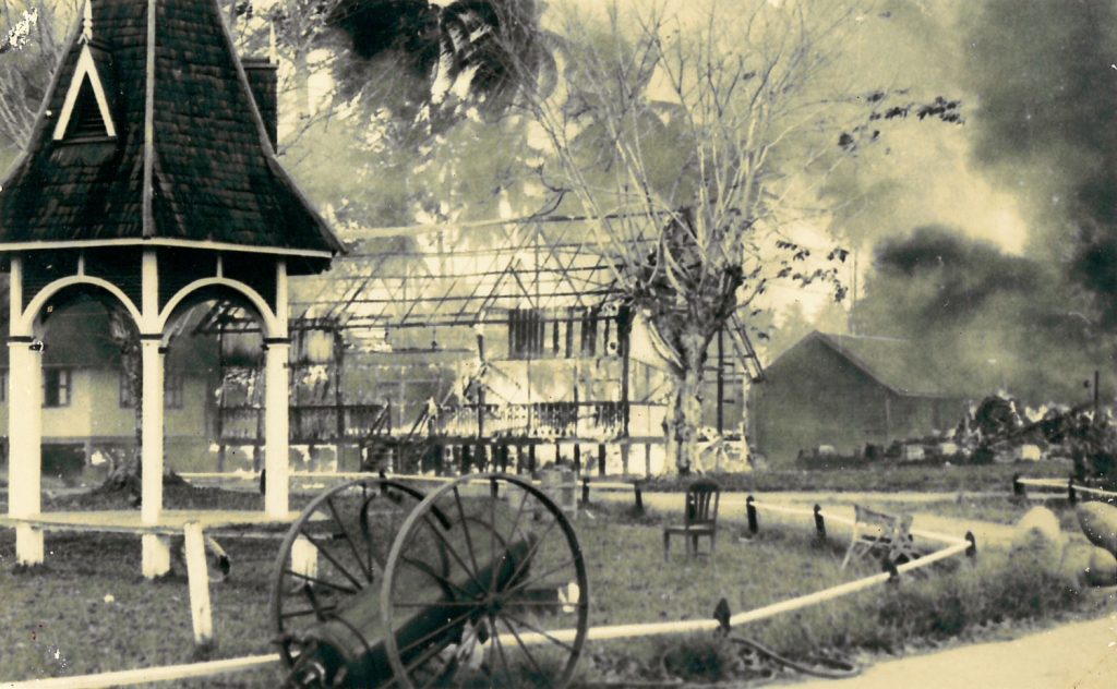 The Great Fire of 1953 razing through shops in the town. The Tawau Bell Tower and Town Padang which still exist today are located on the foreground