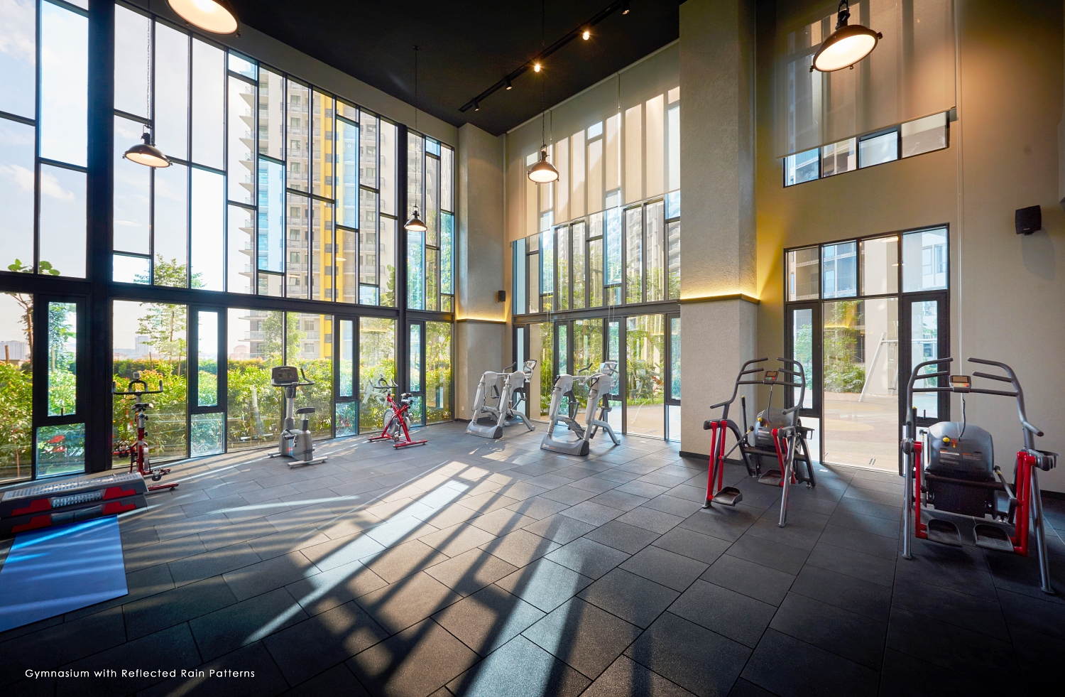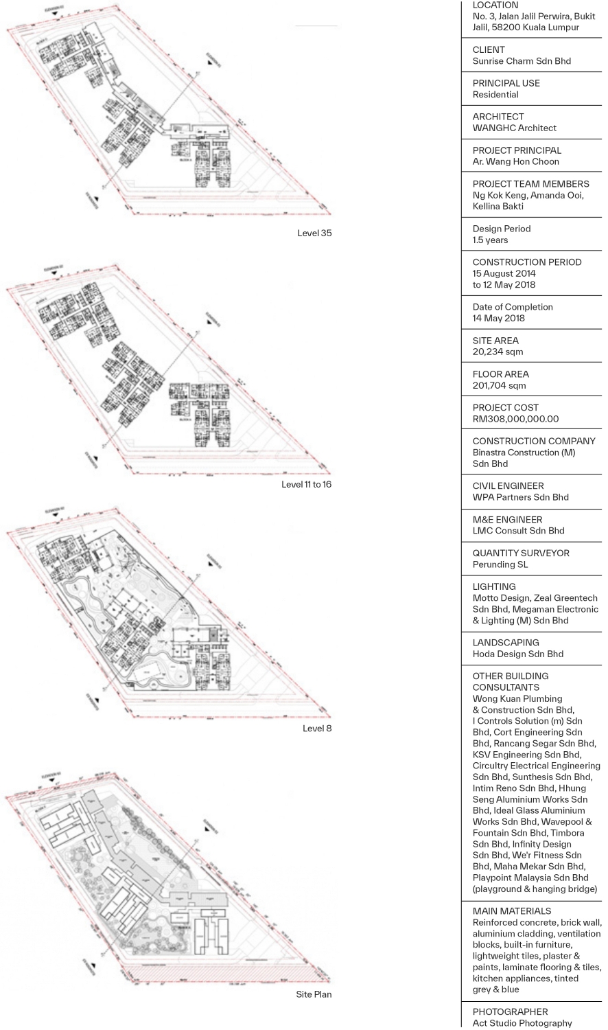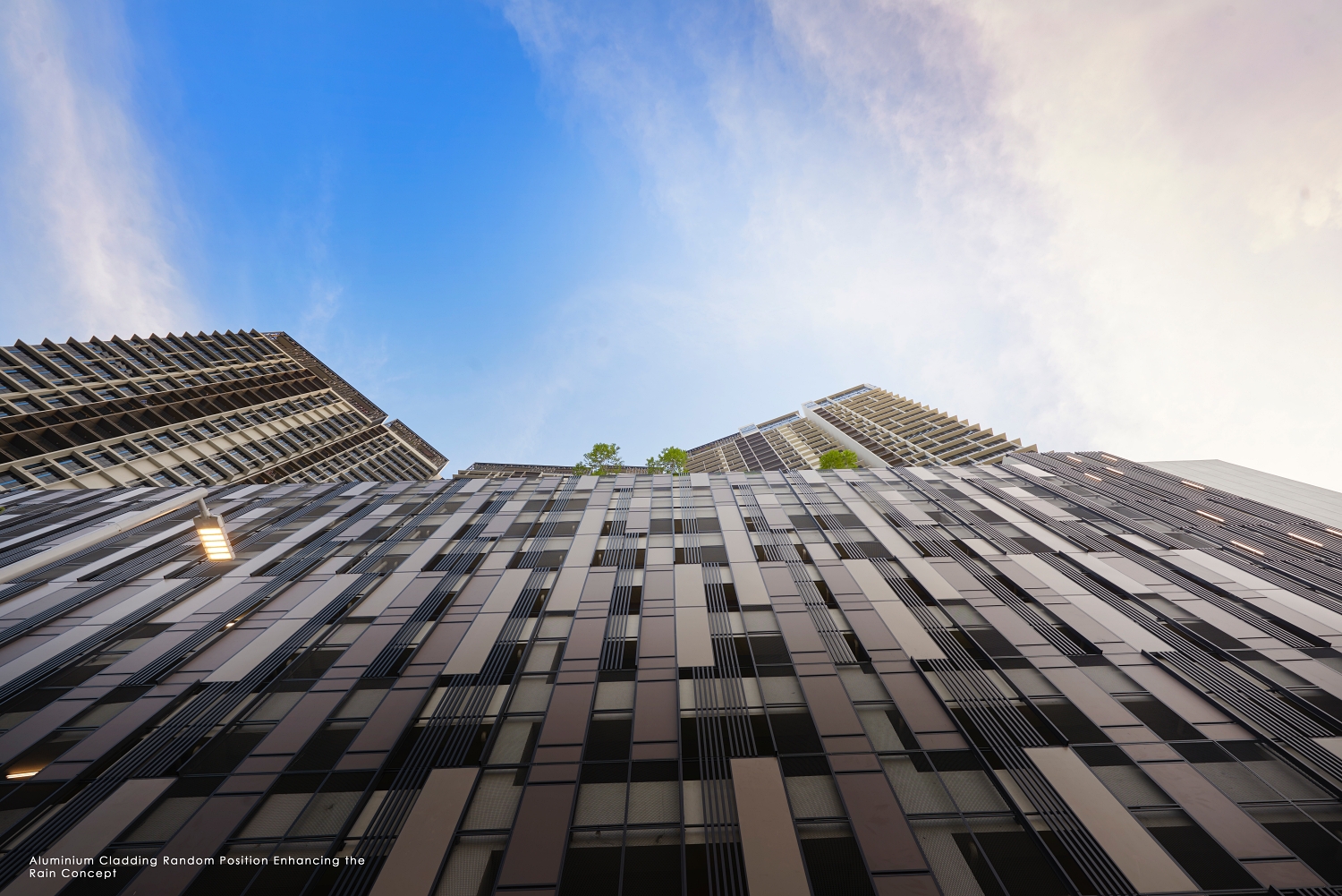 Inspired by the patterns of the rainfall, the building incorporates vertical aluminium claddings which are arranged to mimic its configurations on the podium façade. Further to this, ventilation blocks were also arranged in a seemingly random manner to replicate the patterns of the rainfall. Moving on to the towers, the use of lightweight concrete vertical fin and tinted glass was also incorporated to narrate the rain pattern on its façade. We seek to explore of usage of simple and basic building materials to not only enforce the concept in a subtle way but to also create a new design language within an enclave of high-rise apartments.