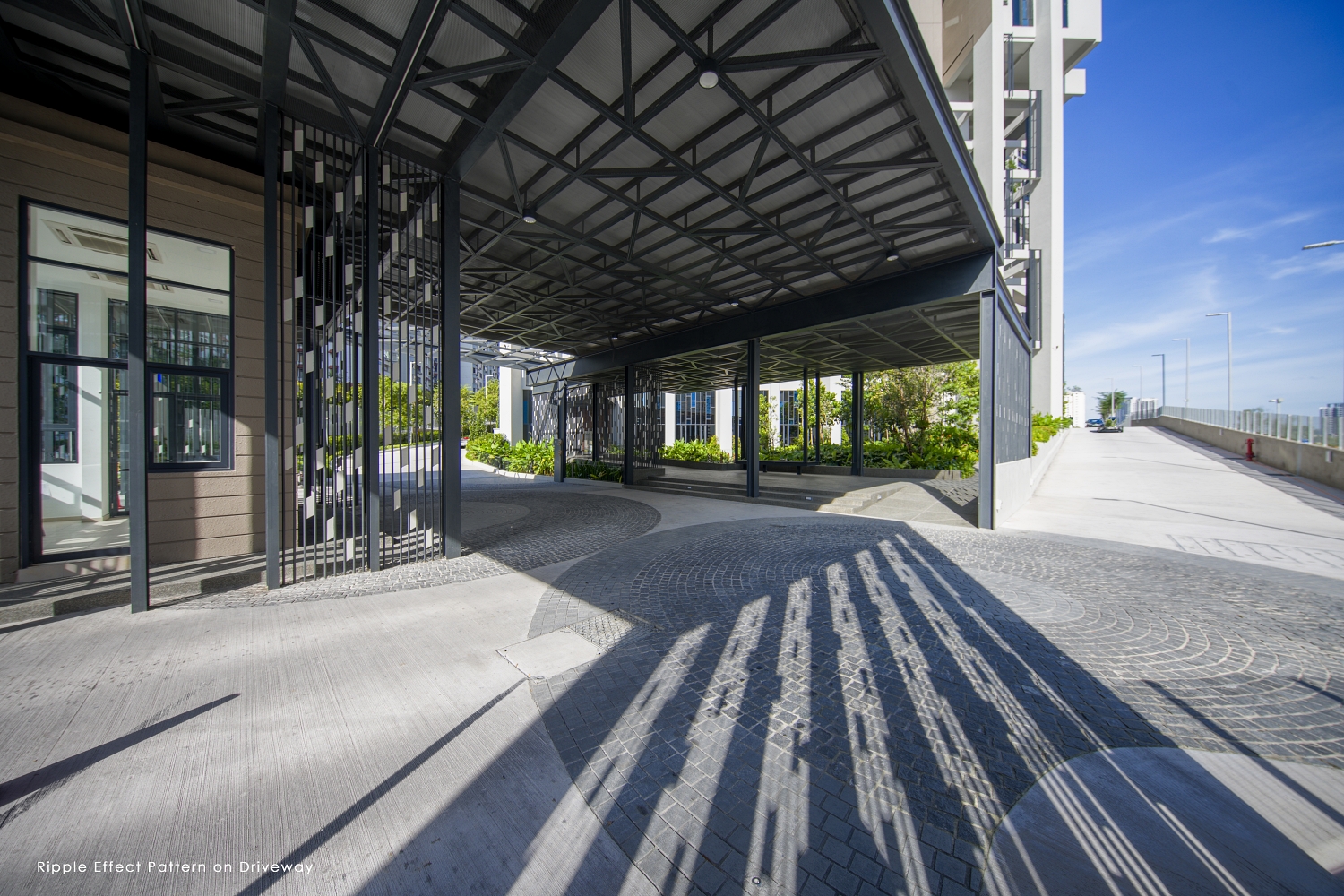 Extending from the rain patterns, the rain ripple effect can also be seen in the driveway pattern at the entrance gate and Level 8 facilities floor. The rain ripple effect pattern was incorporated across the floor in an expanding circular design, creating a pervasive ripple effect that spans out, which also makes for an interesting design when seen from an aerial view.