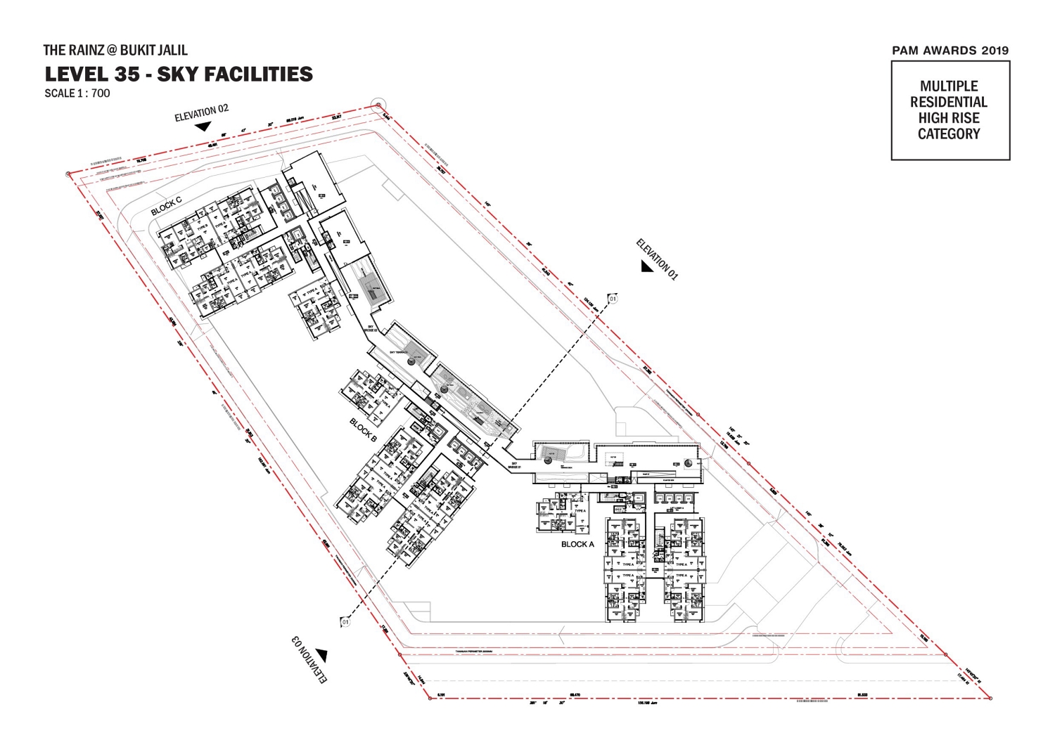 Towering at 36 storeys high, the Rainz was arranged as 3 towers positioned in an arc linear configuration sitting atop a 7-storeys high parking podium. These 3 towers were positioned as such to maximise the accessibility to views of the various landscape elements and the city, as well as to encourage natural ventilation within the apartments. These towers are strategically connected via bridges at Level 9 and Level 35 for ease of accessibility to the various facilities availed to the residents.