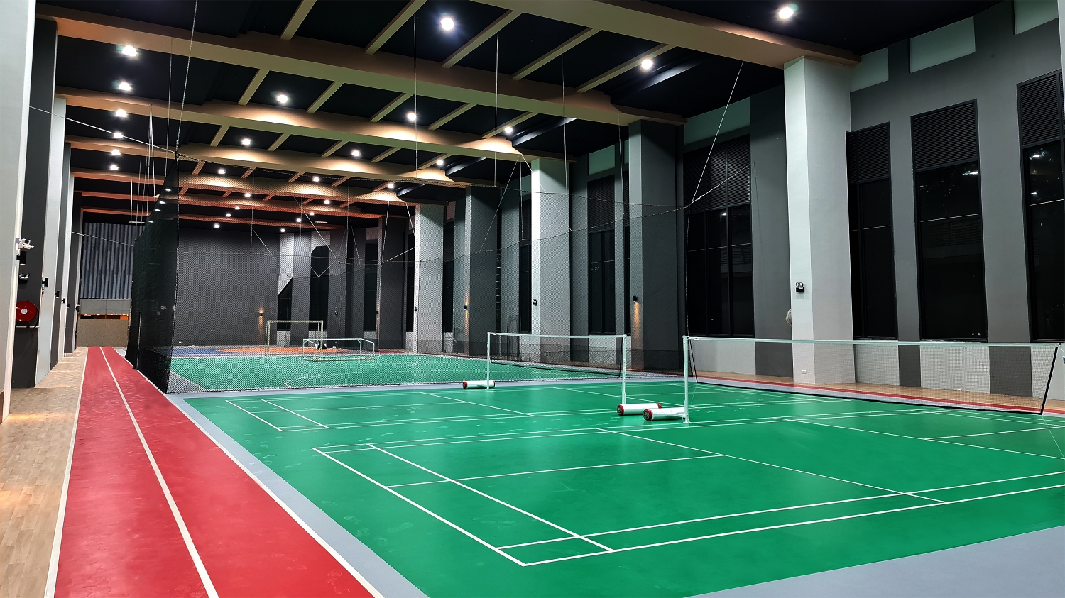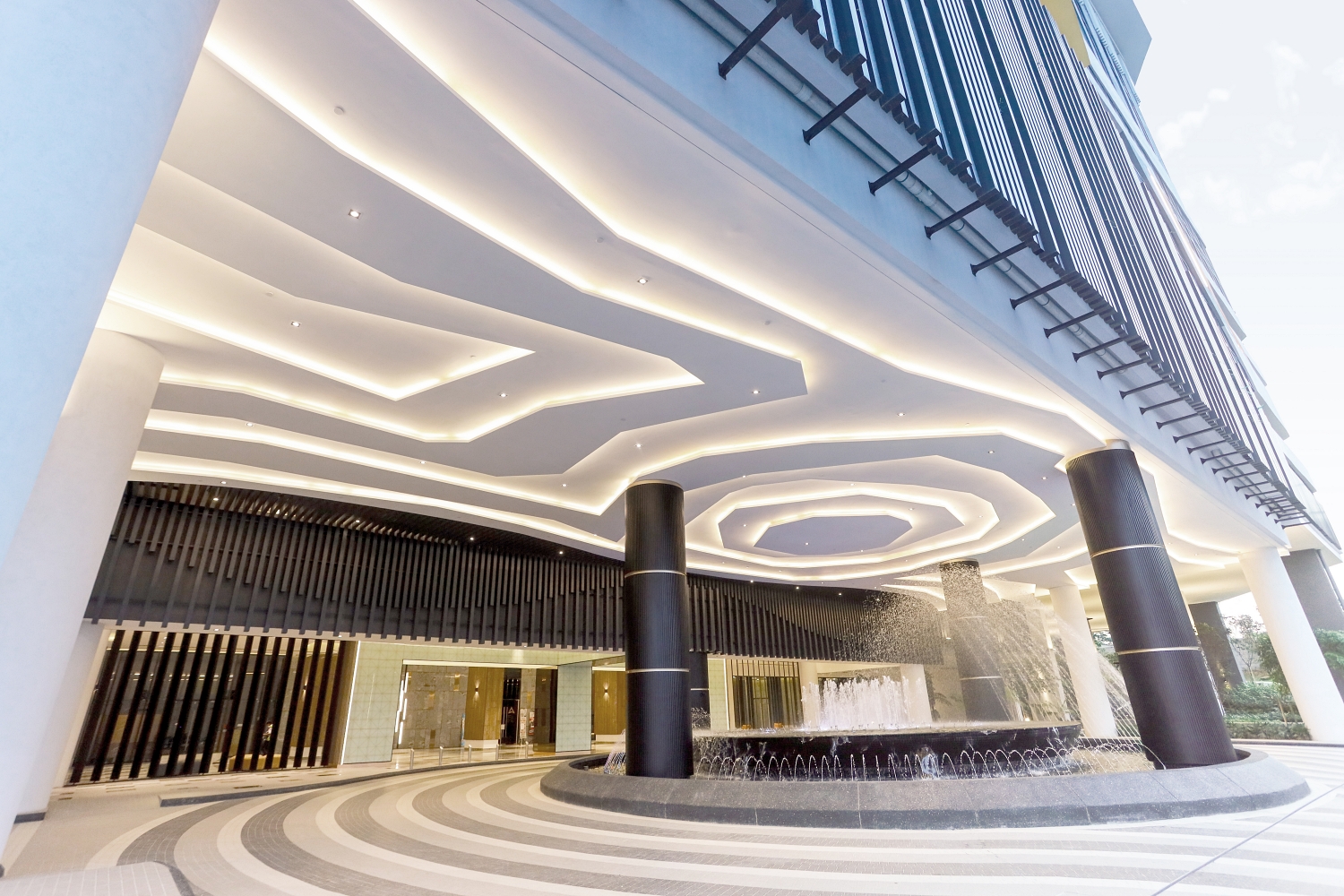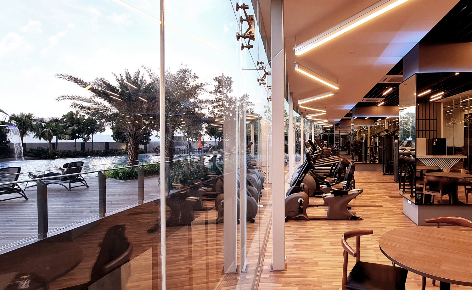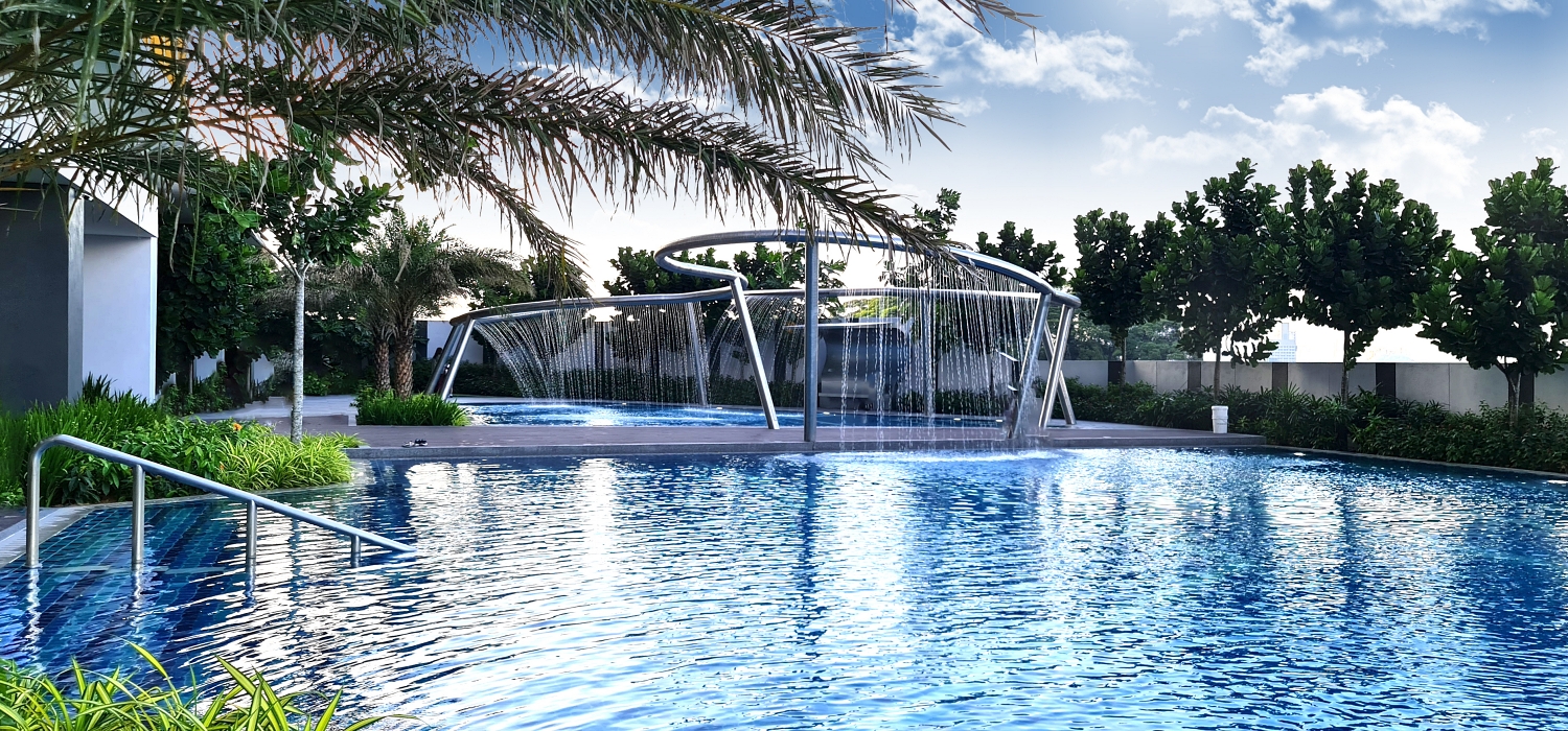 Through the lobby, visitors gain access to a slew of podium facilities that encourage an active lifestyle. From swimming pools featuring custom rain curtains, stepped fountainheads that create personal waterfalls, and a splashing terrace by the poolside to a dedicated sports hall large enough to contain a basketball half-court and two badminton or futsal courts, the podium facilitates recreational exercise. Gym users may peruse a built-in bar counter to rest and relax while enjoying a view of the nearby pool.