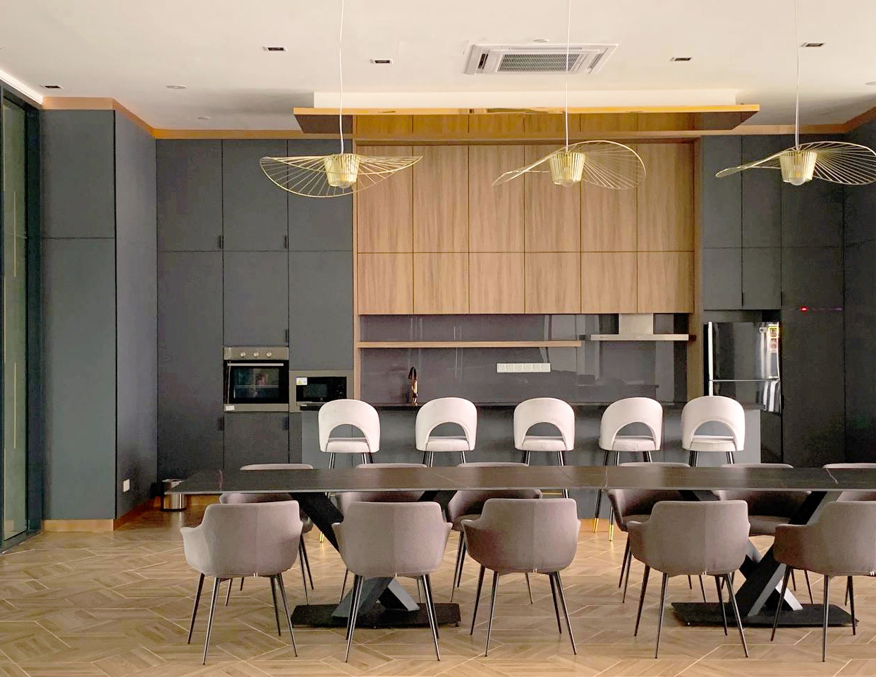 A bubbling water fountain greets visitors just past the guardhouse, announcing the location of a grand triple-volume entrance foyer reminiscent of a hotel lobby, replete with granite stone cladding and stainless-steel inlay studs, marble-like floor tiles, panelled columns, large glazing, and articulated ceiling. A kindergarten is securely tucked into a corner of the main lobby, complemented by a play area that takes advantage of the site’s sloped terrain to create a children’s slide on one side. Five industrial ceiling fans keep the space comfortably breezy.
