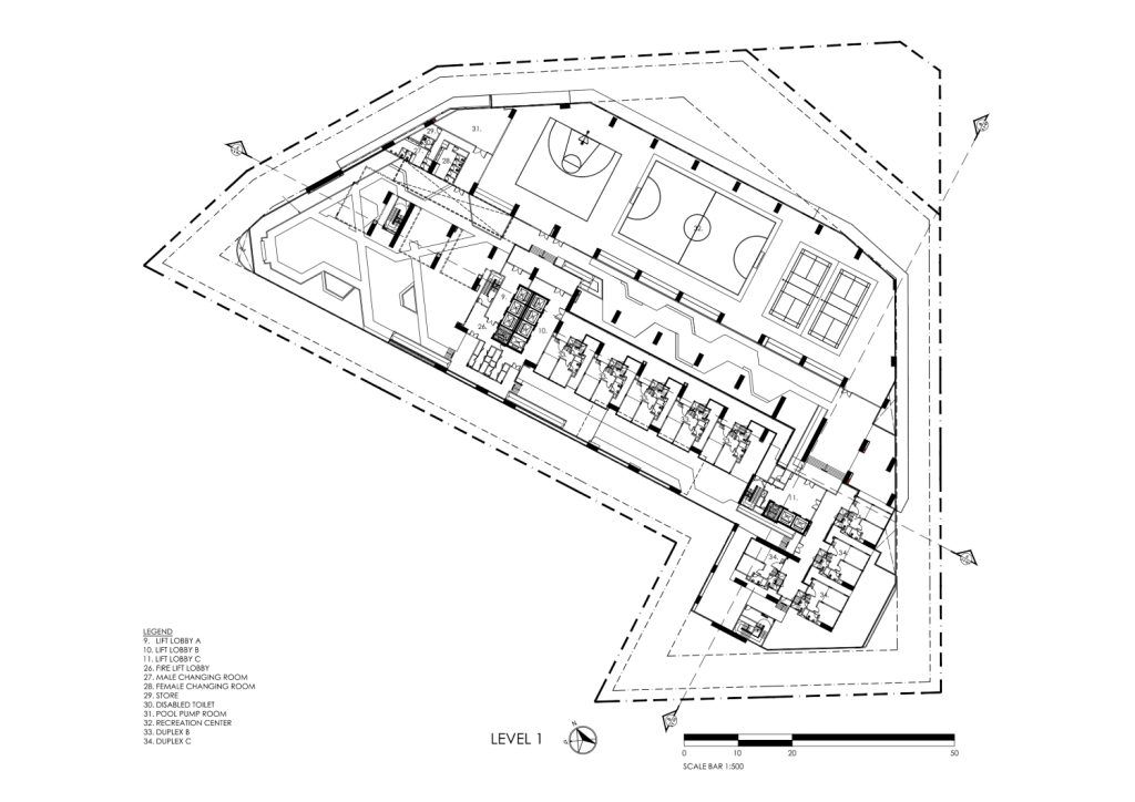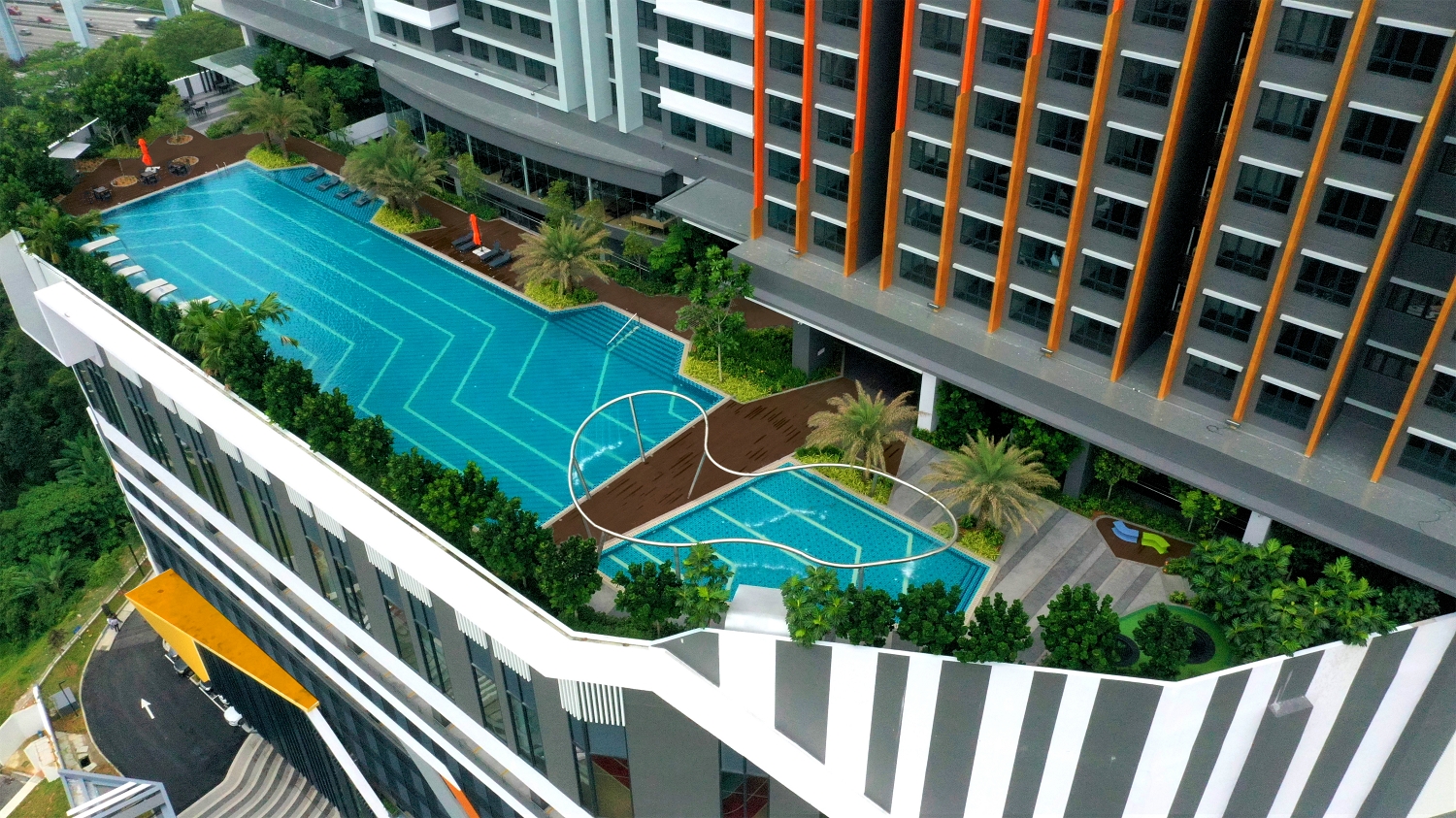 The 2.82-acre site is particularly fraught with undesirable visual obstructions, with a TNB high-tension pylon in front and two sprawling highway interchanges at the back and to its left. To mitigate this, the floor-to-floor height of the car park floors is raised to 3.3 metres each, elevating the podium above the highway. A 12-metre-tall sports hall shields the TNB pylon from view for residents living on lower floors. Behind the sports hall, tucked behind a well-shaded, lush green corridor and elevated above eye level, is a series of villa-style duplex units which enjoy double frontage with a high degree of privacy. Units face a landscaped path on one side and a distant view of pool facilities on the other.