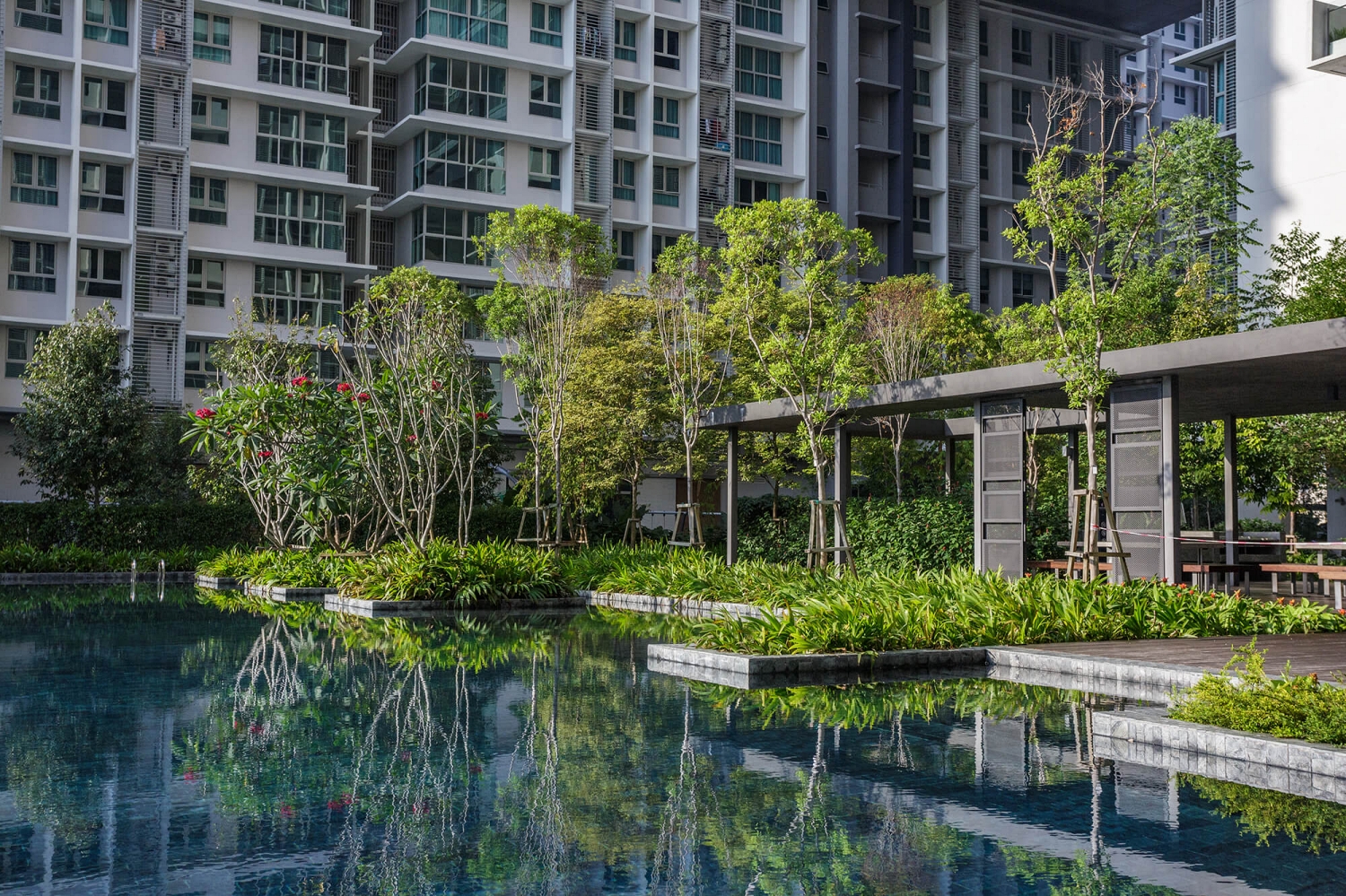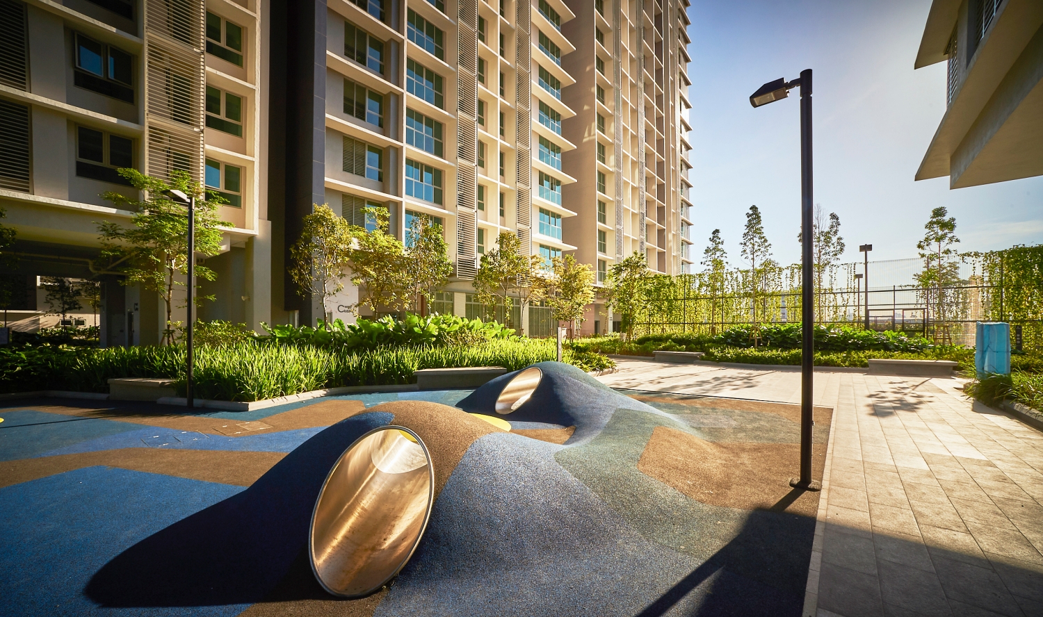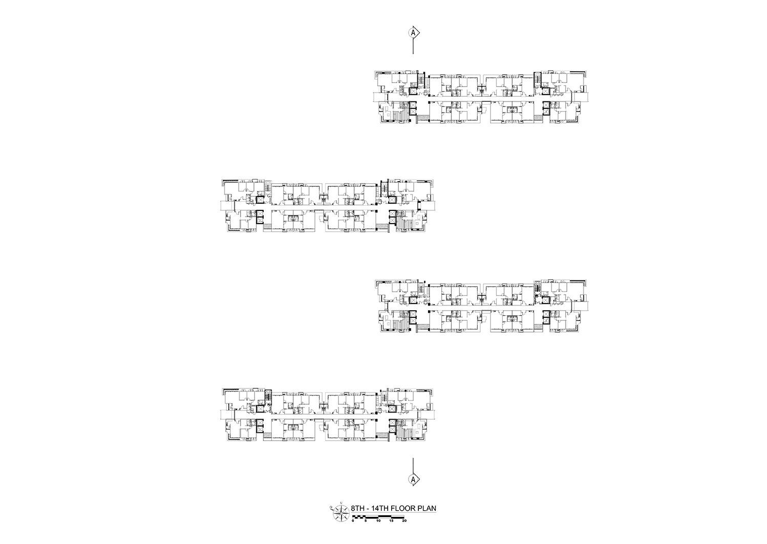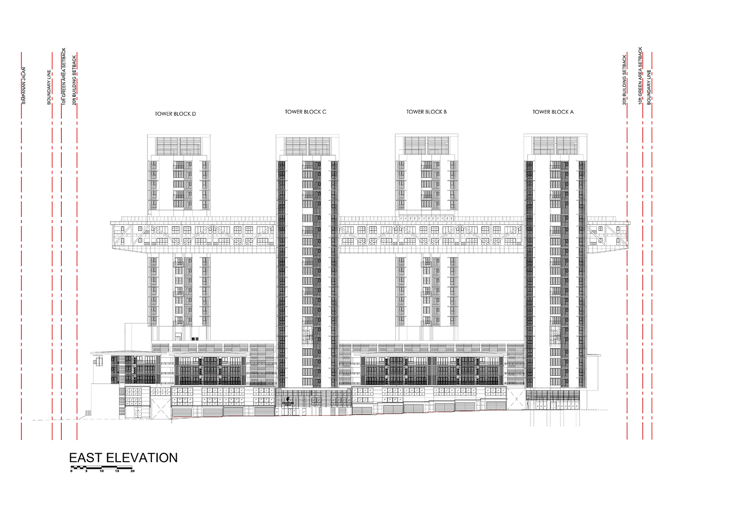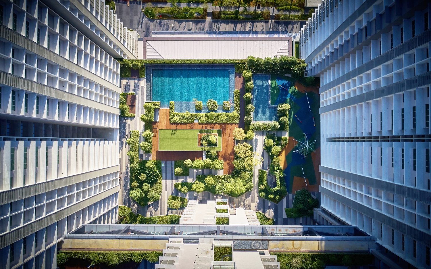 Four apartment blocks, each 24 stories high and identical in length are staggered on a plan on top of a vast podium on Level 6 with extensive facilities, outdoor spaces and landscaping.
