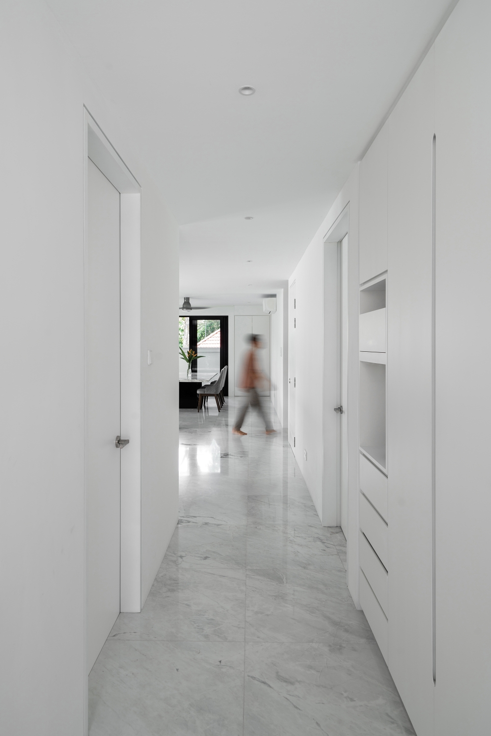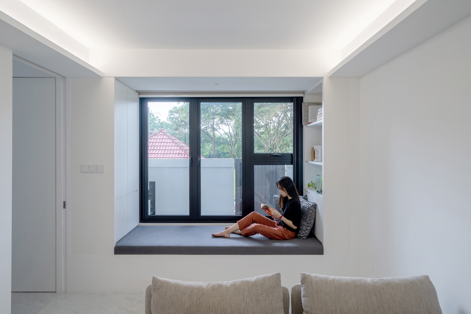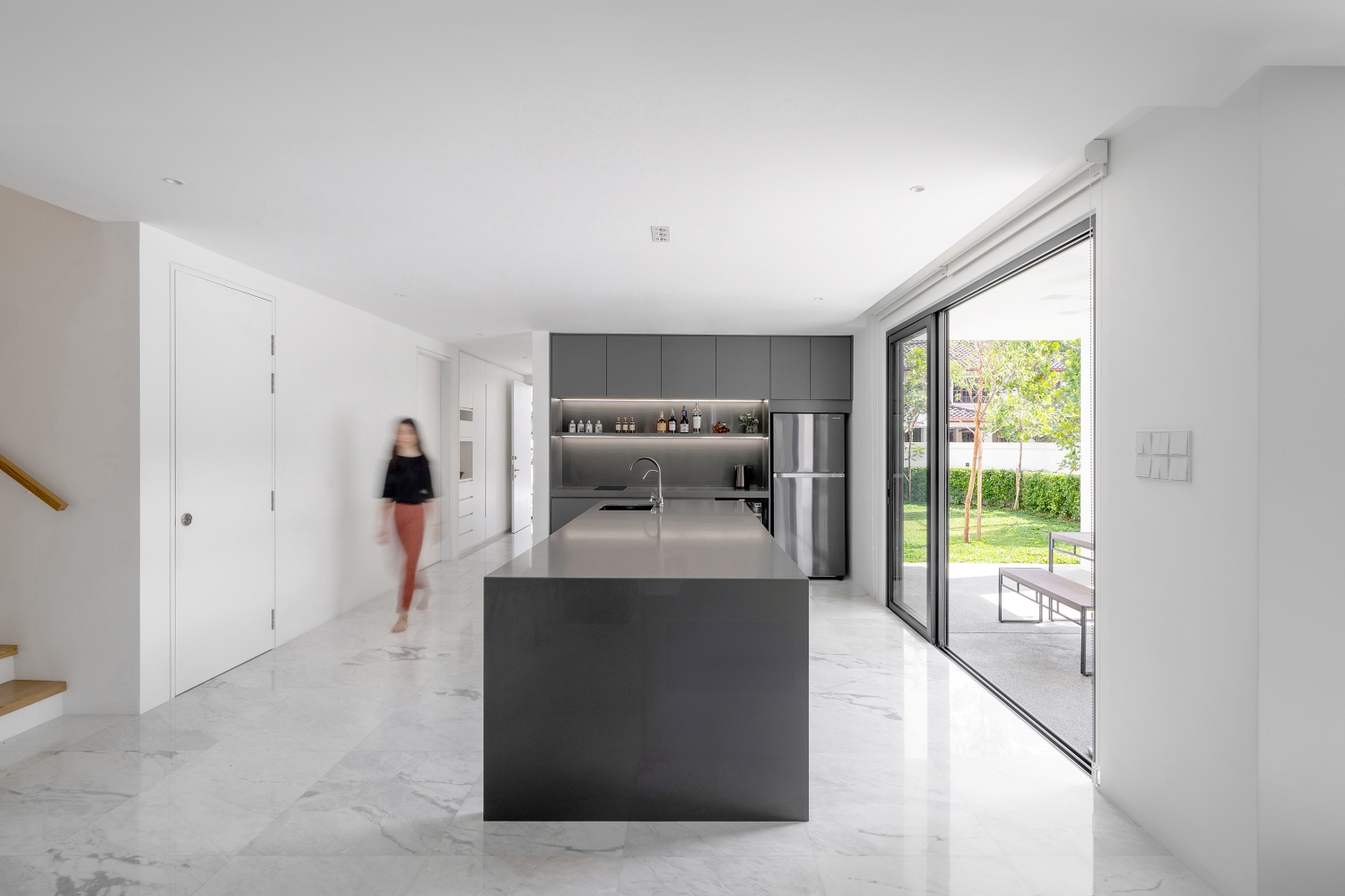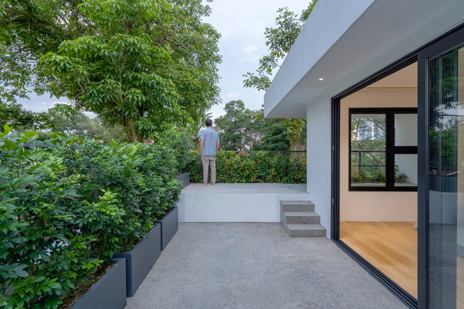 The main living and dining spaces face the rear enjoying the views of the park, defying the conventional layout of terrace houses where they are typically located at the front. Adjacent is an entertainment area featuring a modern French window.