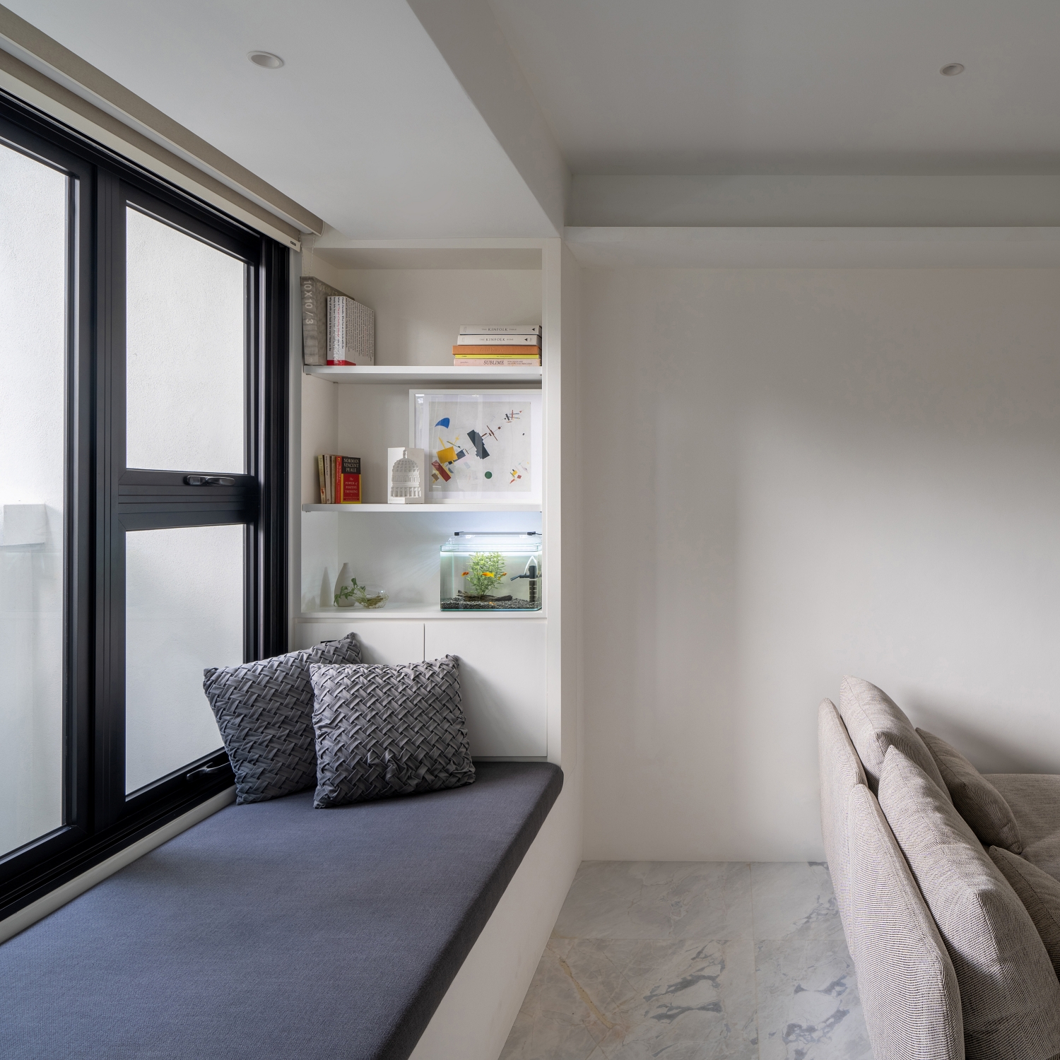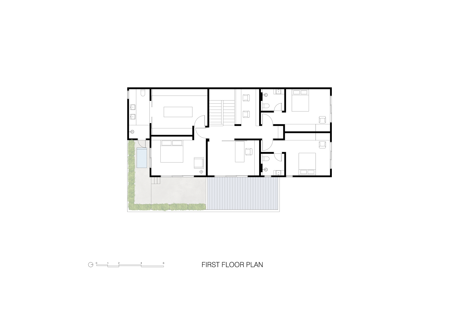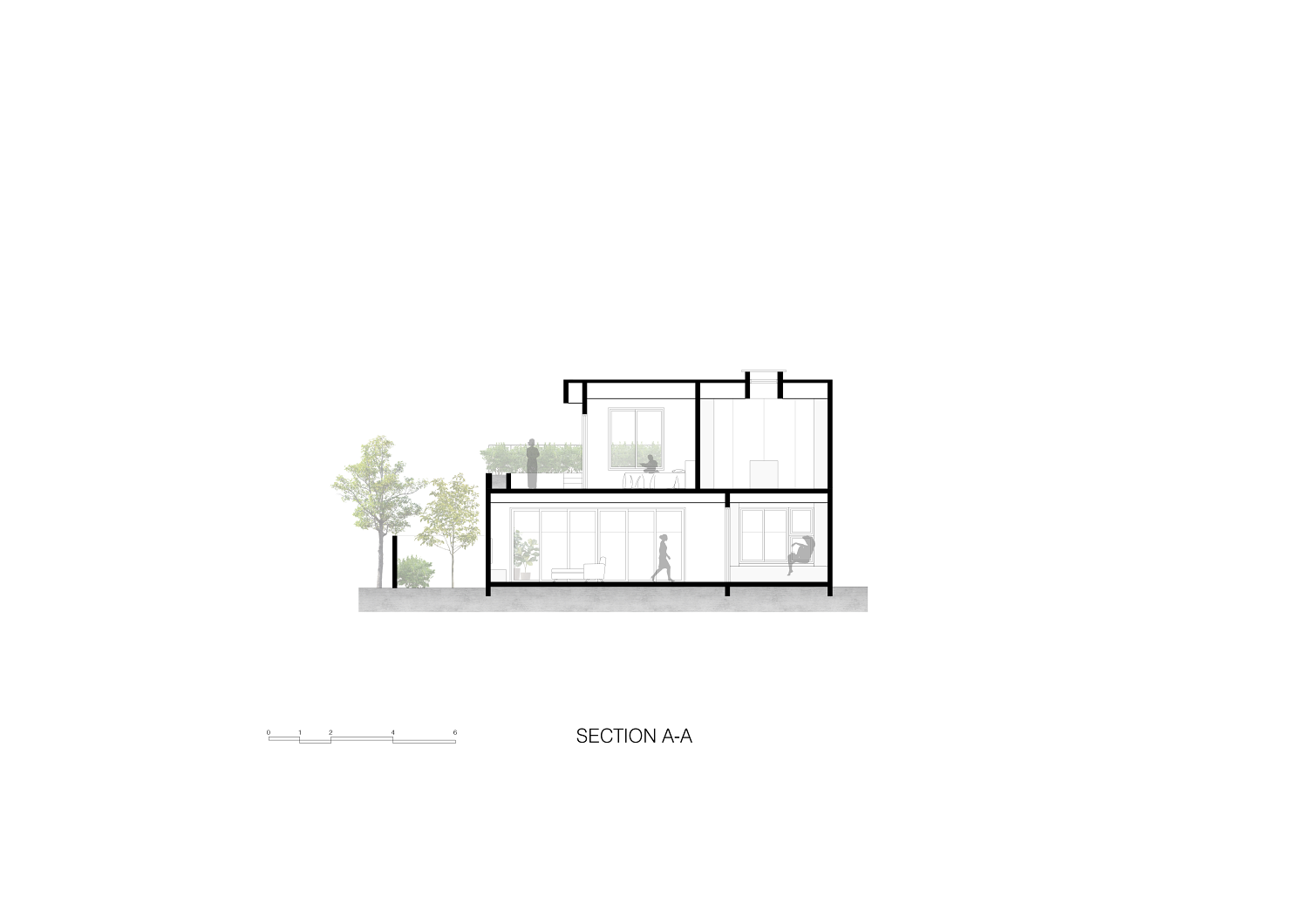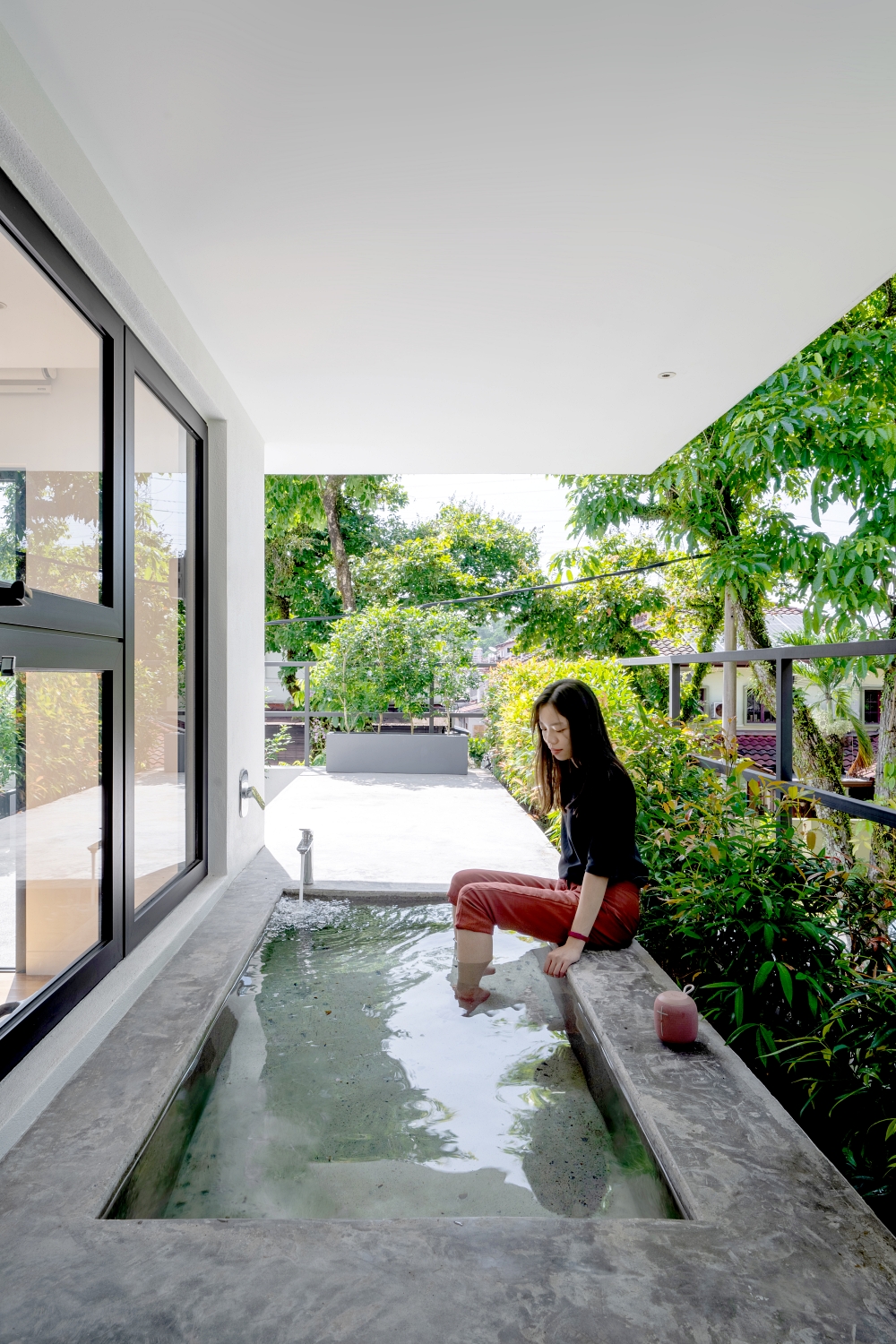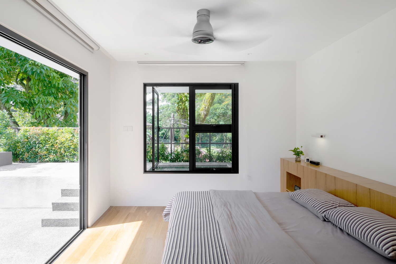 Upstairs, there is an open kids’ study area that receives borrowed light from the master study’s high slit window and sliding door, which is usually kept open. Two bedrooms face the front of the house, while the master bedroom enjoys views of the corner and the rear park. Multiple levels of balconies have been created to enhance the enjoyment of the outdoors, and the presence of a private sunken bath adds to the experience. Connected to the side, there is a spacious walk-in wardrobe naturally illuminated by a skylight, along with the master bathroom.
