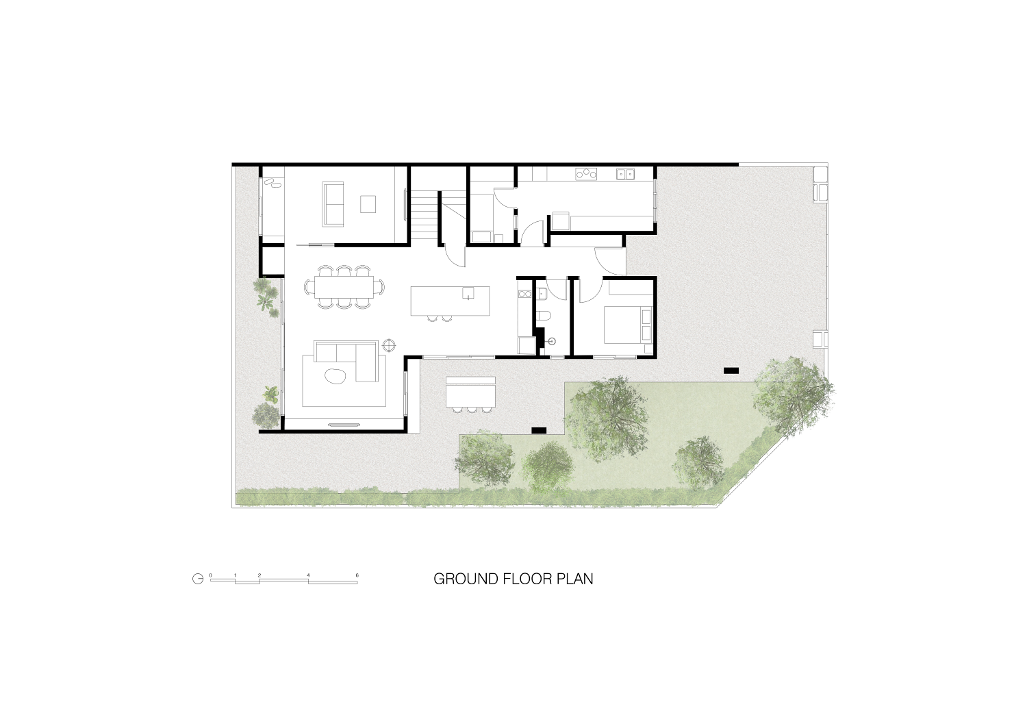 The concept for the house was to naturally open up towards the corner, embracing the garden as a bridge connecting the outside to the inside.