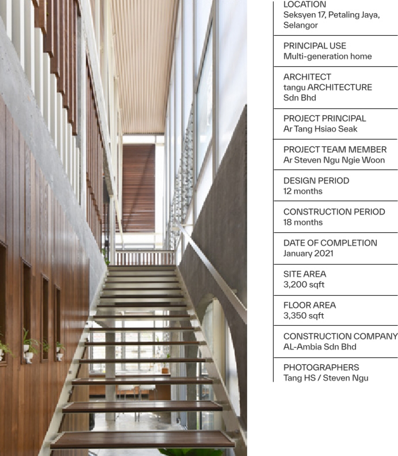 In an established suburb of Greater Kuala Lumpur, within a closed-knitted community, lies this east-fronting house that had been renovated incongruently over the years. It has now been transformed into a progressive test bed for design innovation, research and development, and trial of ideas and principles continuously developed by the practice. The approach stems from a minimalistic standpoint that “lightness” – of building footprint, carbon footprint, weight, construction/materials and logistics, embedded energy – applied through the well-considered design of the spatial configuration, envelope and form, coupled with the principles of “permeability” of the elements brings forth holistic sustainable solutions. These are fundamentally found in time-tested passive concepts, and vernacular practices, and occur in natural processes and phenomena, as expressed in the equation below: