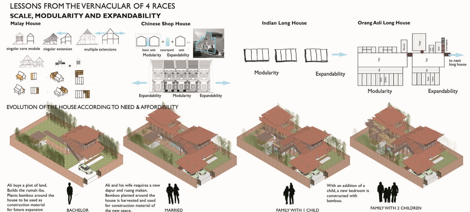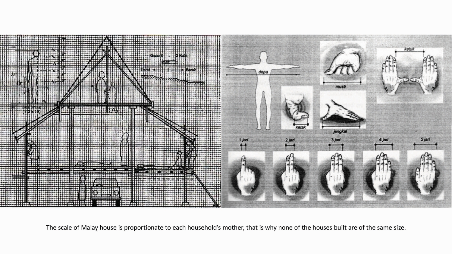 The house has been designed according to scale and proportion in reference to Malay house dimensioning systems. System Depa – the dimension between the tips of the fingers of the horizontally out-stretch arms often used to measure lengthy objects and wide spaces. The smallest unit is one jari or the width of a finger. One jari or more is often used to measure smaller elements. It is essential to use local measurements to allow the architecture to have harmony with its users.