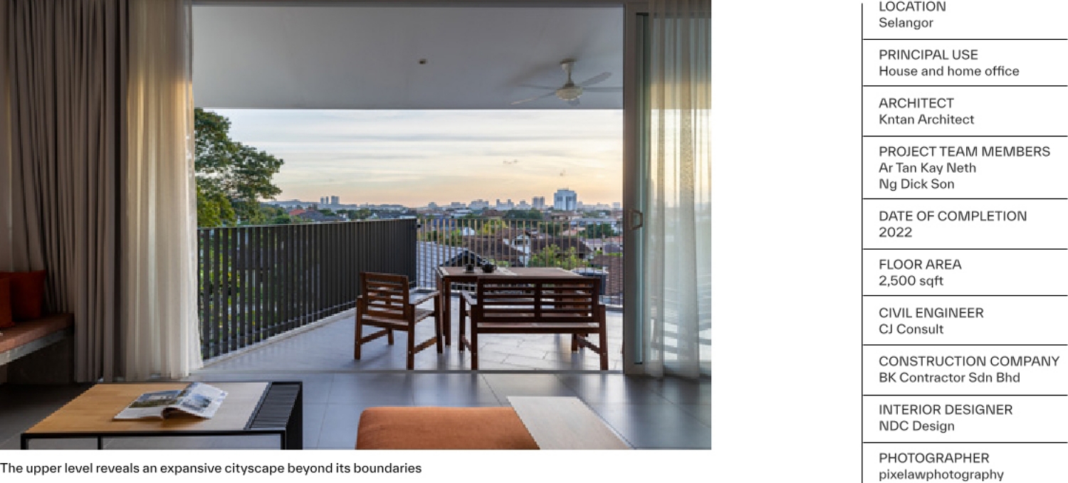 Besides that, the upper floor rotation is also to strategically position the mass away from the harsh western sun without compromising the framed view of the city skyline. The dynamic form of the house created a pocket of balconies on the upper floor while the cantilevered structure gives shade to the patio of the house below.