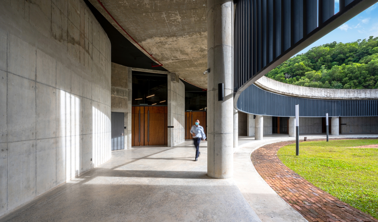 Raw-finished concrete is chosen symbolically as blank canvas inspiring artists’ creativity and through time blends in with the surrounding nature. Internal spaces are left raw leaving room for creativity, and allowing maximum flexibility to end users and artists alike. When it is furnished, creative colours are introduced to emphasise the eclectic minds and set the creativity of the students from within.
