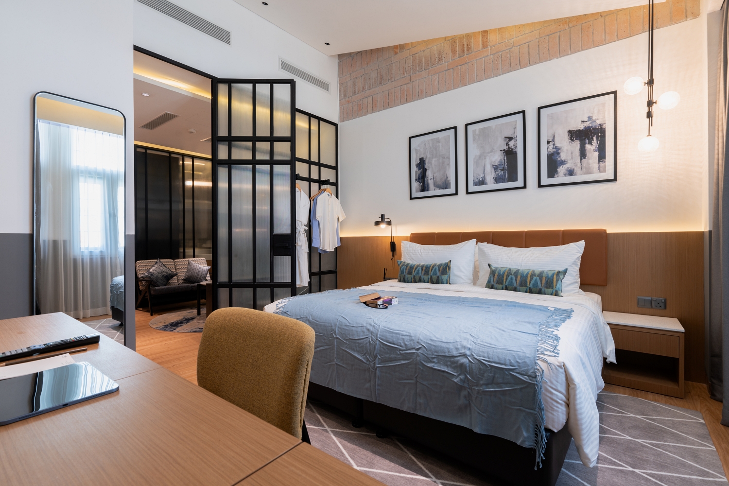The architects made a bold decision to create a simple network of internal corridors by demolishing a part of the party wall separating each shophouse. Doing this allows the entire cluster to function as a cohesive hotel complex without compromising on its heritage assets. Level 1 is entirely dedicated to hotel rooms, accessible through a private liftlobby. The rooms come in a variety of sizes, from studio types to two-bedroom suites.