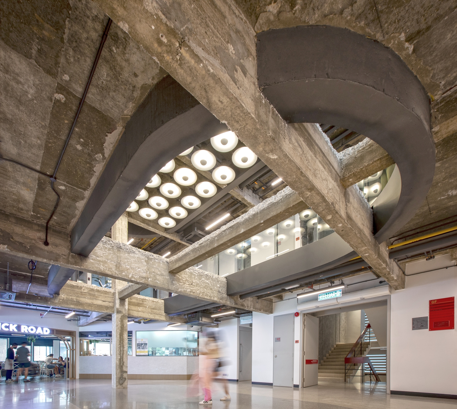 Shops, restaurants and cafes revolve around the atrium as the new centre of gravity. The void creates a new sense of openness and establishes a visual connection between floors, encouraging guests to visit the upper floors. The interiors are left bare and clean with terrazzo, exposed concrete and services. The colour accents are leftto the wayfinding and the fit-out of the 15 boutique tenants.