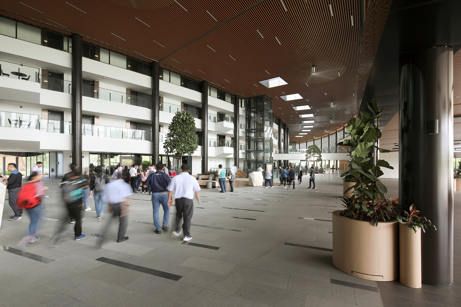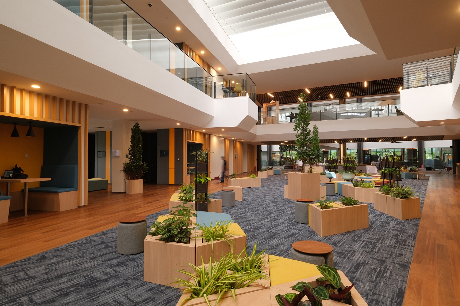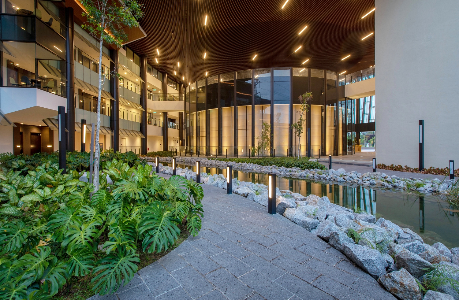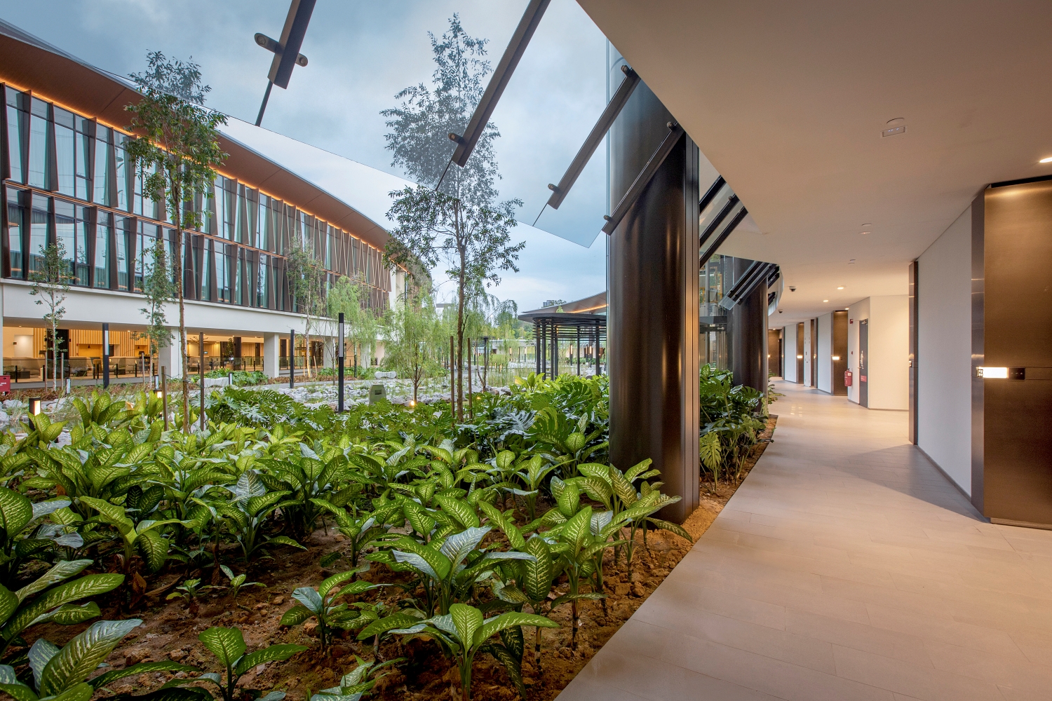The building adopts an open and flexible concept in the design approach that blurs the boundary between internal and external. In addition to the functional objectives to coexist with the surroundings, this openness encourages users to be psychologically more open in knowledge transfer and more transparent in interacting with their colleagues.